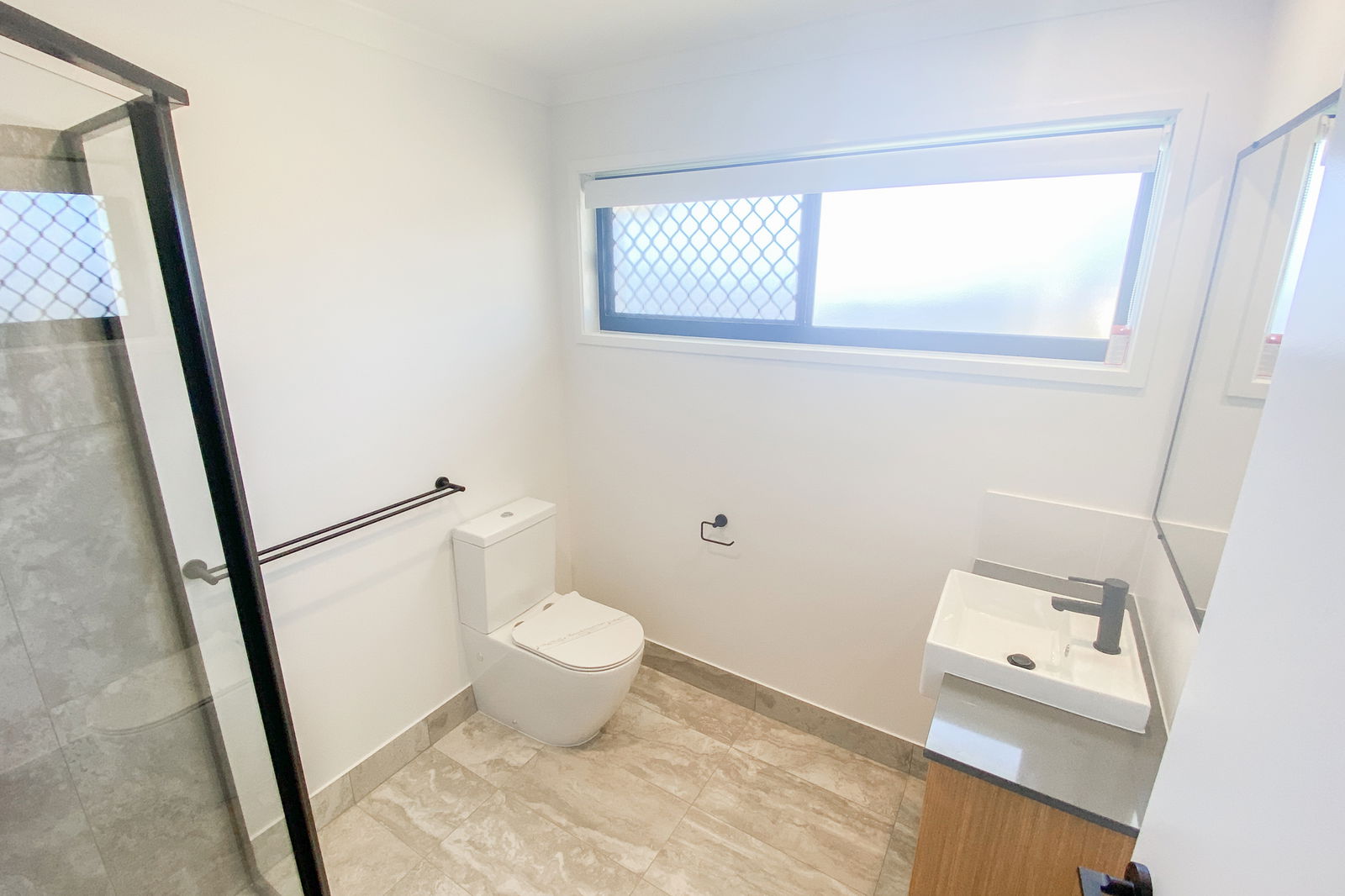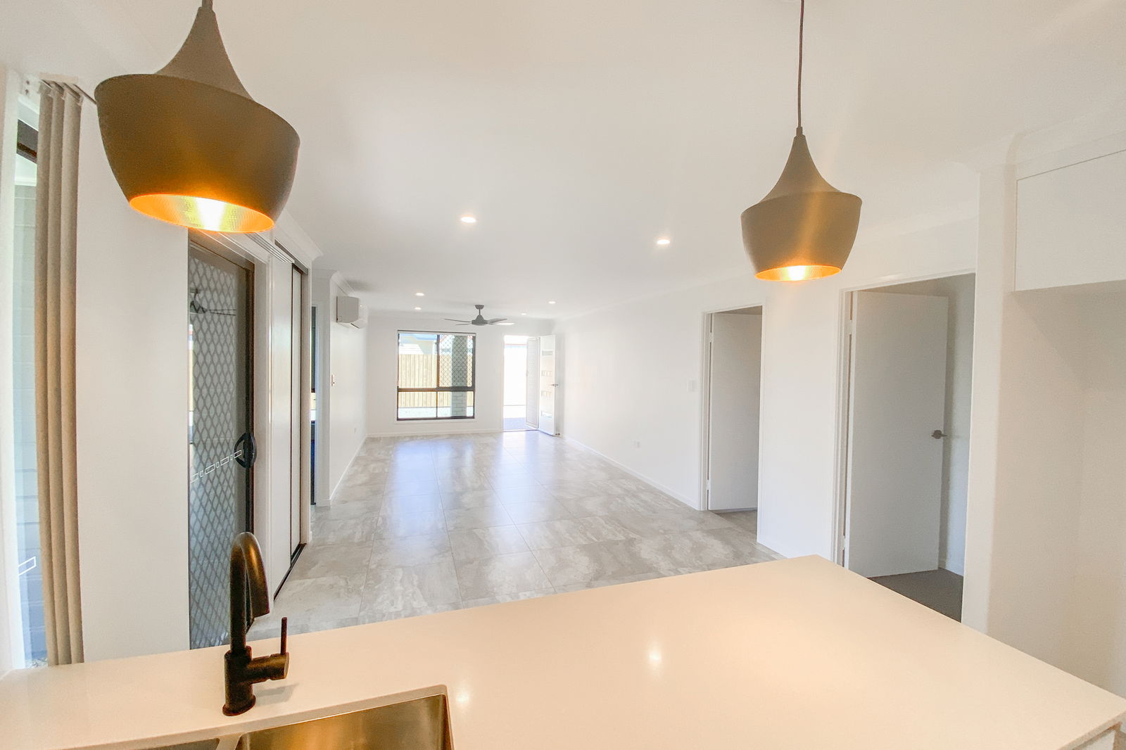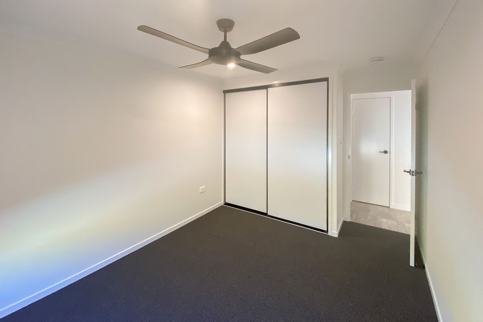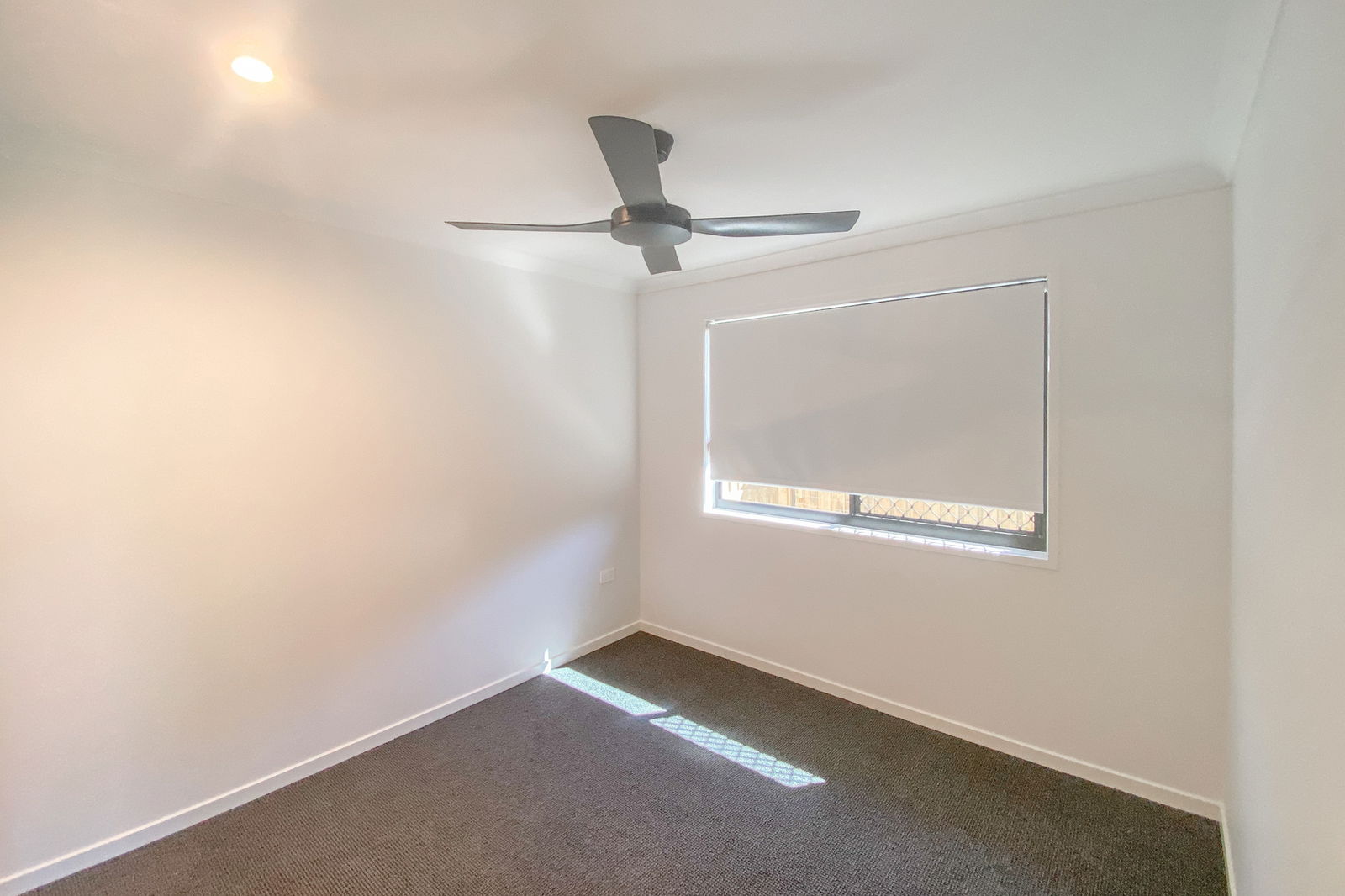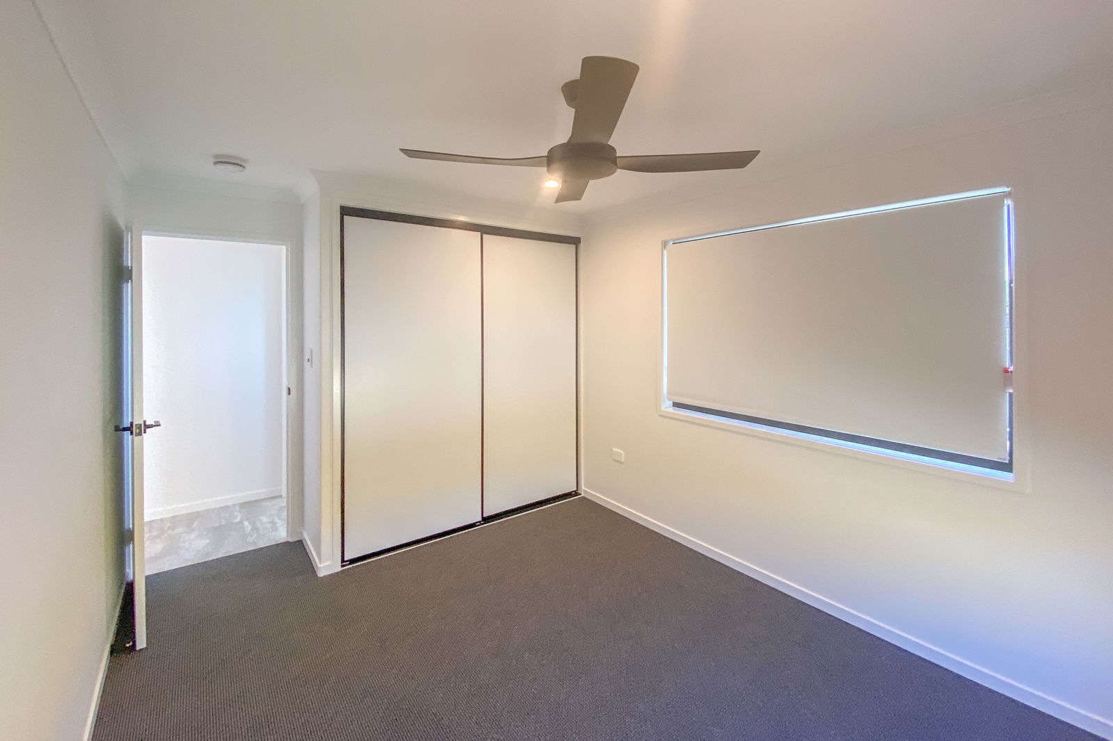 - Two bedrooms with large built-in wardrobes, ceiling fans, roller blinds, and security screens