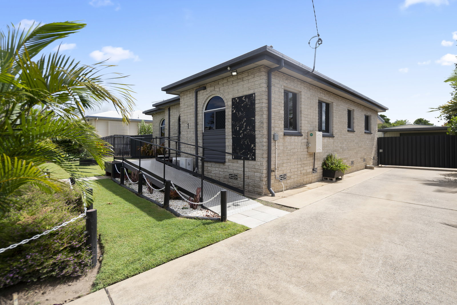 The bathroom has been thoughtfully designed with accessibility in mind, complemented by a wheelchair-friendly ramp at the front entry.