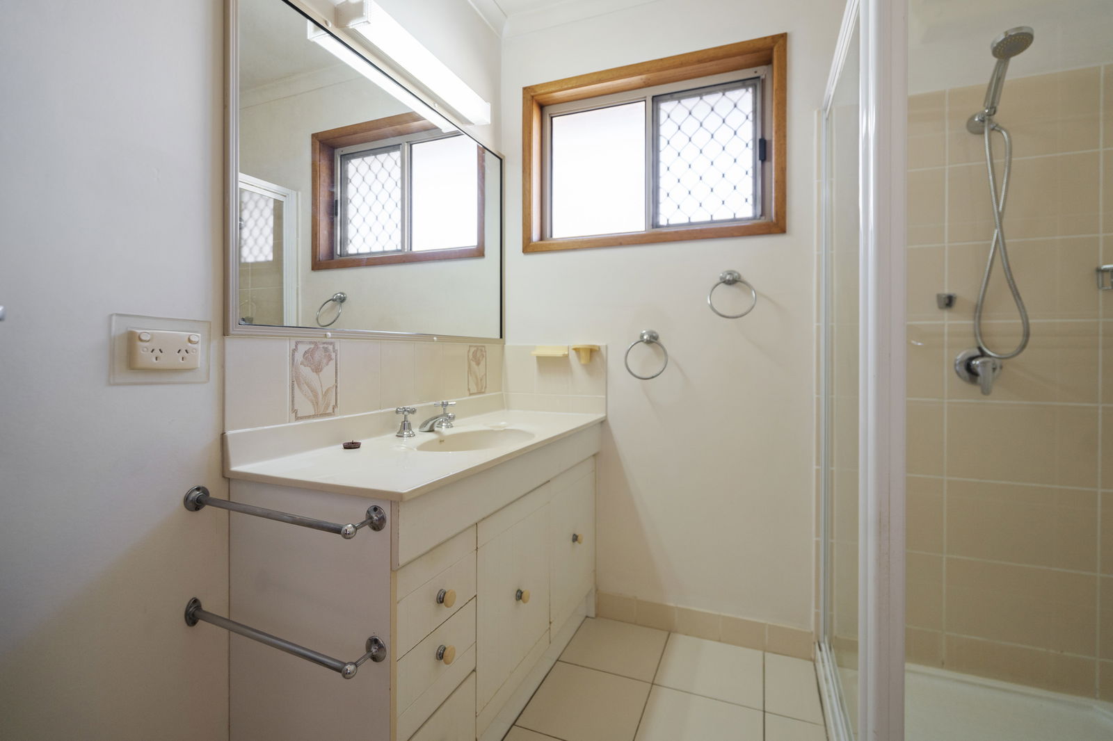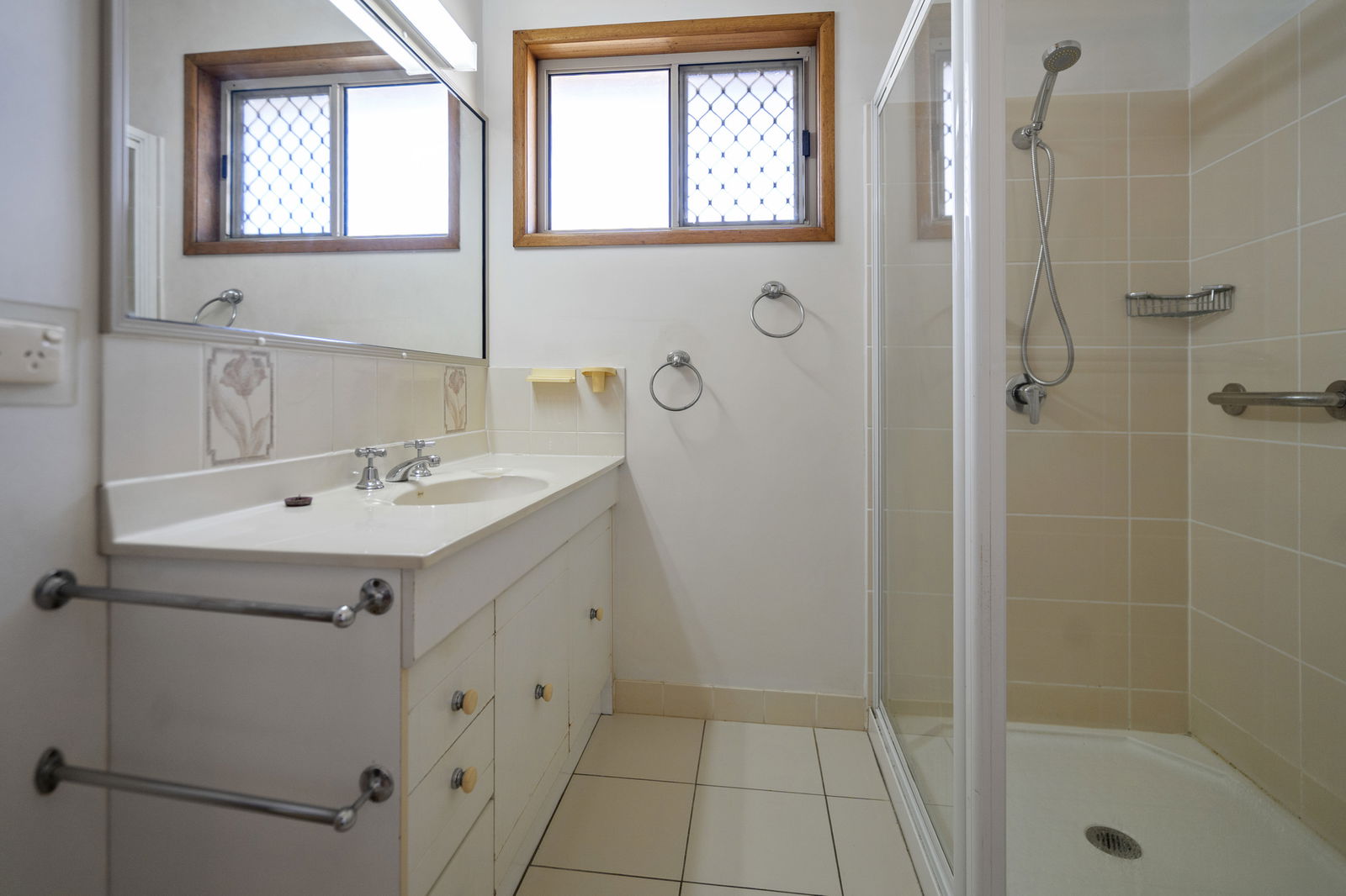 - Centrally located bathroom with shower and vanity
