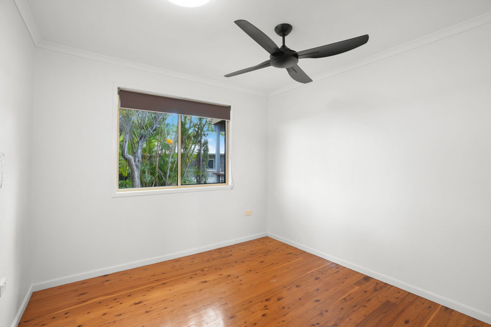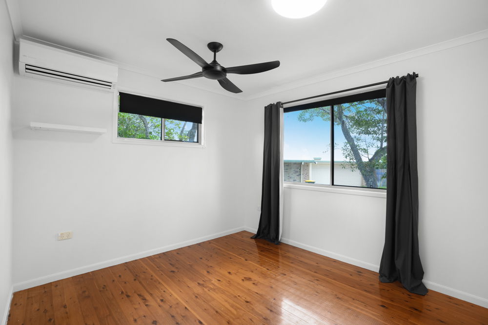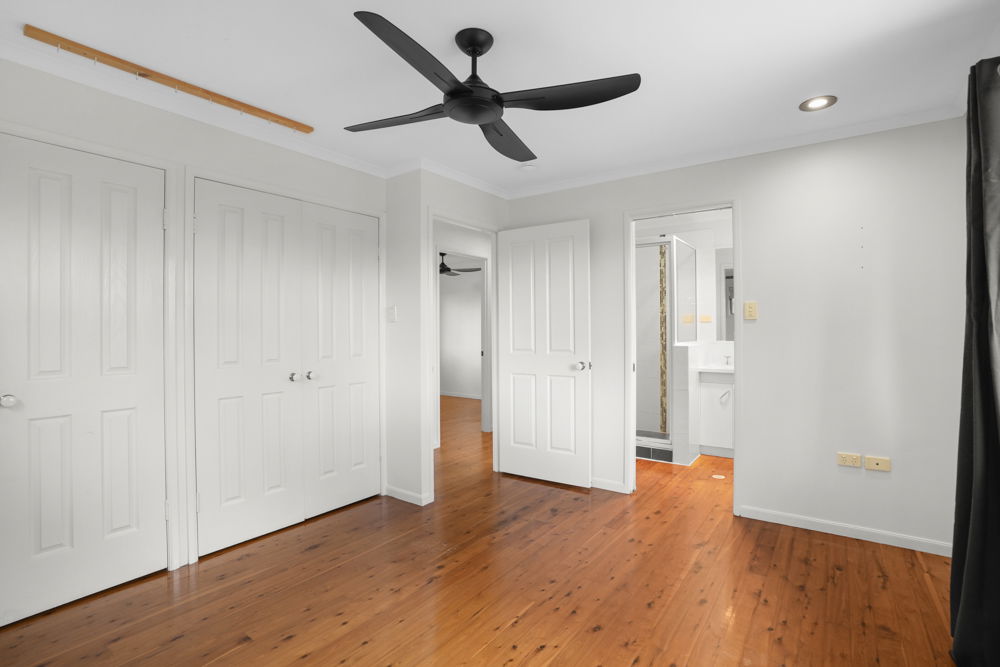 Down the hall you will find the large master bedroom that features box air-conditioning, a ceiling fan, double built-in robes, and direct access to the main bathroom. The second bedroom has built-in robe, ceiling fan and split system air-conditioning for added comfort. The third bedroom is equipped with a small built-in cupboard and ceiling fan.