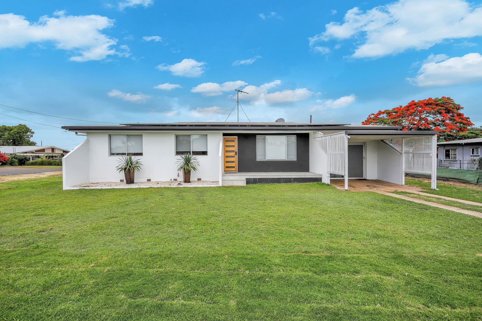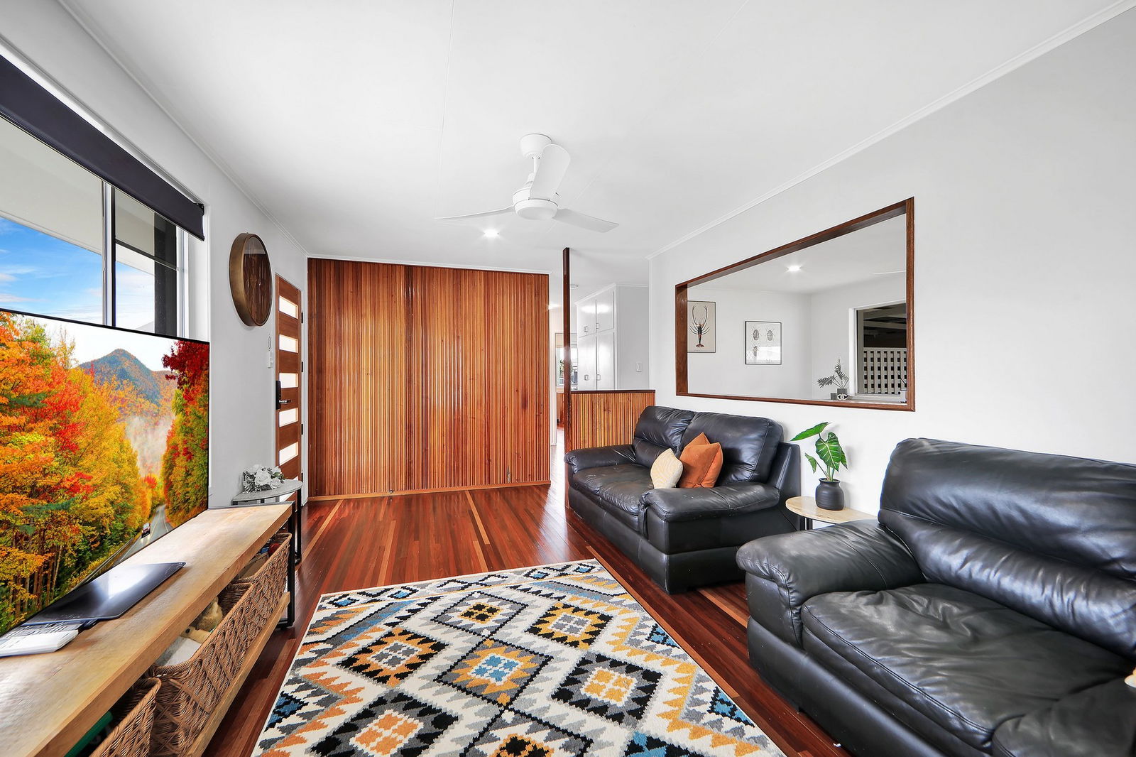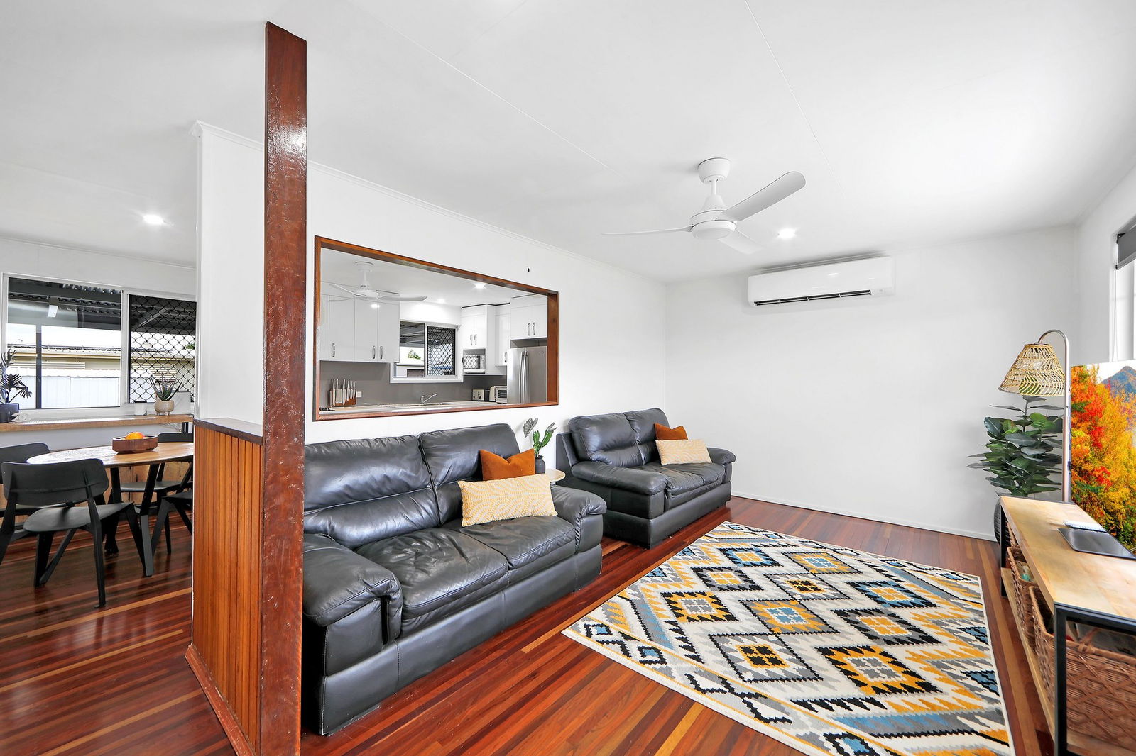 Inside, the home offers an open plan kitchen and dining area equipped with electric appliances and a dishwasher, ideal for everyday living and entertaining. Stunning hardwood floors flow throughout the main living areas and bedrooms, while air conditioning to the living areas, main bedroom and second bedroom ensures year-round comfort. All bedrooms are fitted with ceiling fans, and the fully renovated bathroom features a modern shower, vanity and toilet.