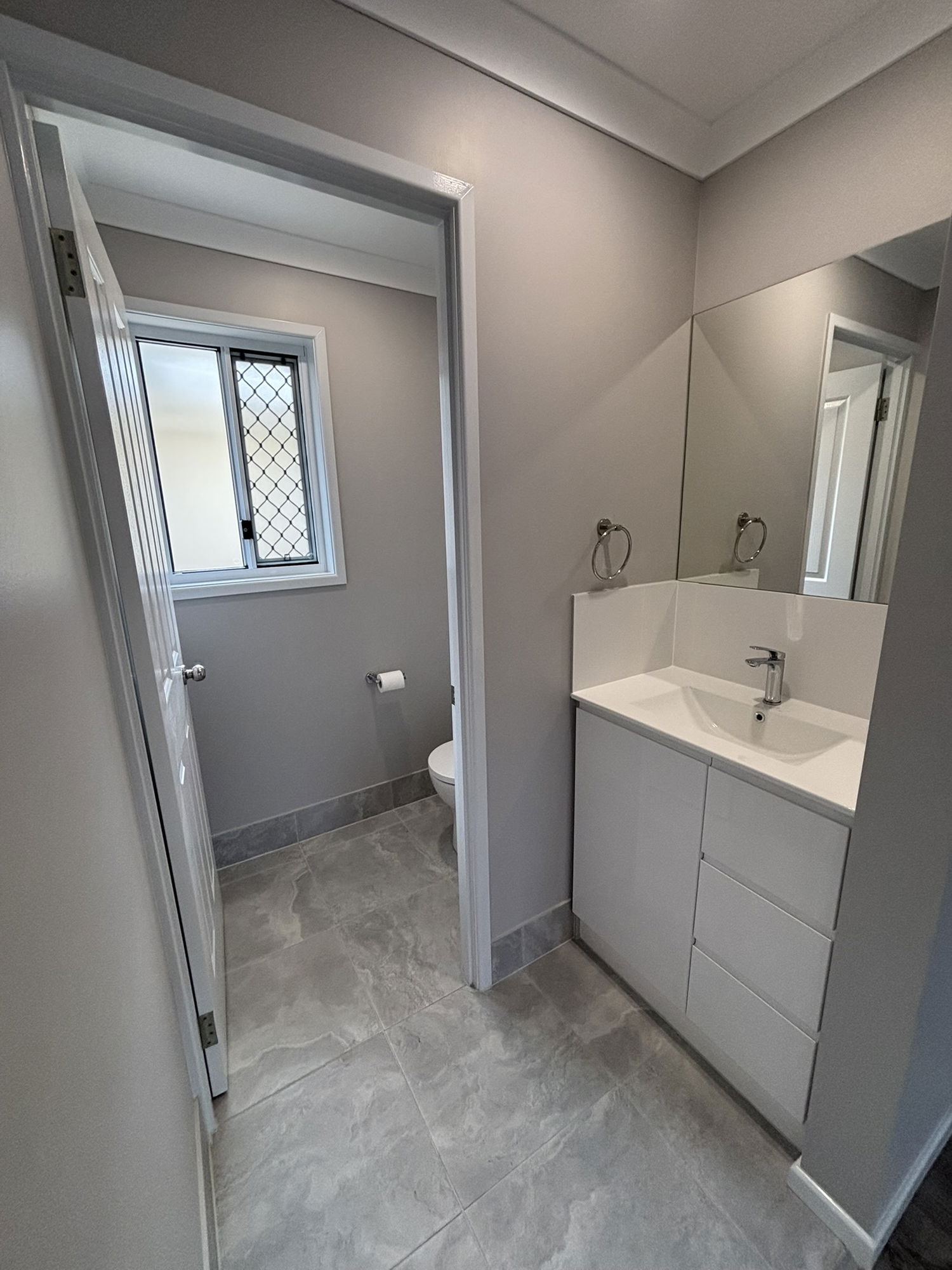 This property features a practical layout with a separate toilet and a dedicated powder room, offering added privacy and functionality. The toilet is located in its own enclosed space, while the adjoining powder room includes a vanity with sink and mirror-perfect for guests.