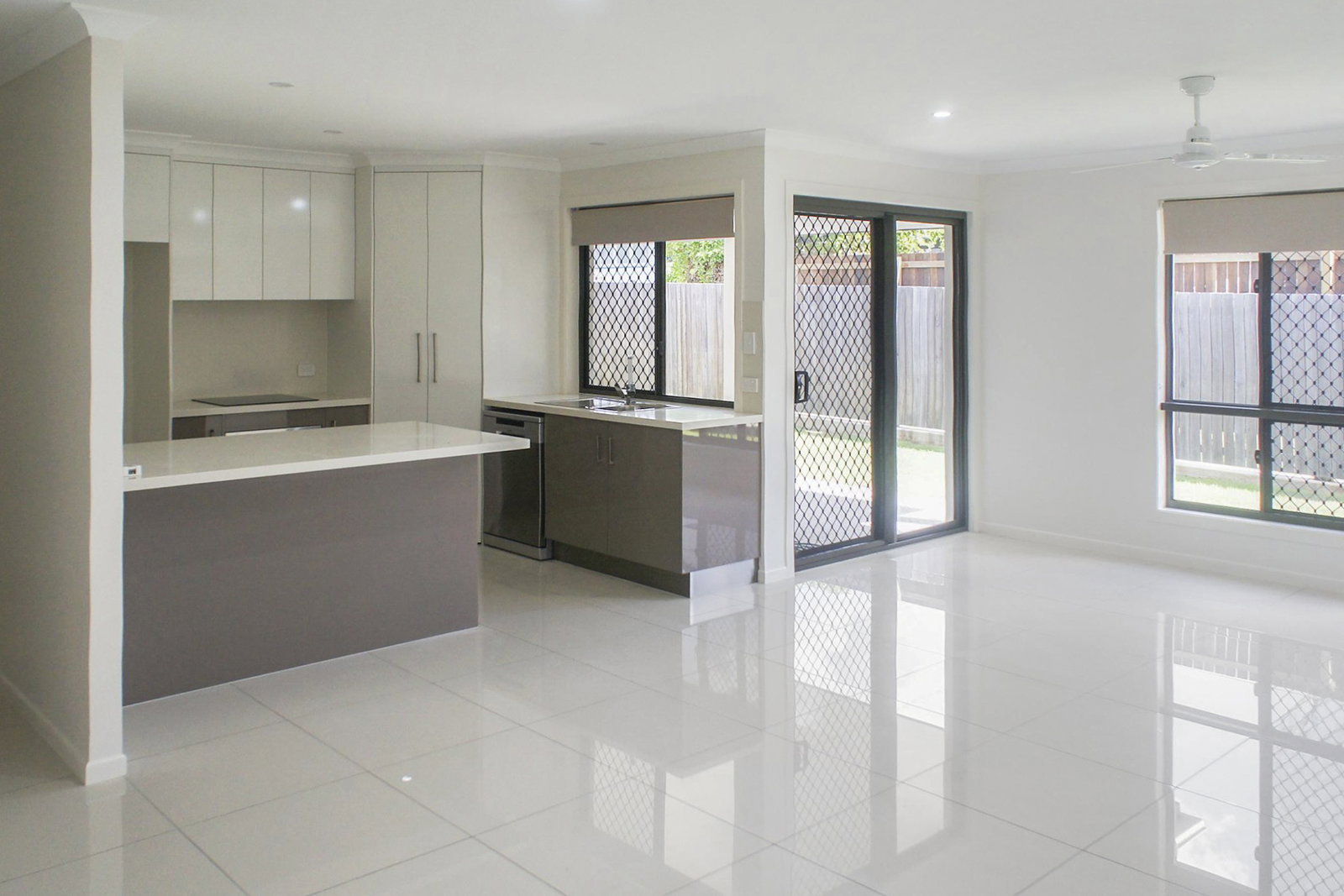 The home boasts a bright and spacious open-plan kitchen, dining, and living area. The kitchen is well-appointed with ample wall and floor storage, self-closing drawers, a two-door corner pantry, microwave recess, dishwasher, breakfast bar, ceramic cooktop, and wall oven.