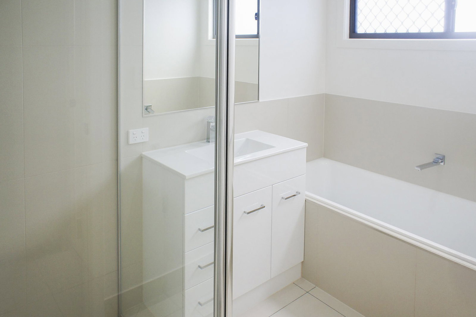 The main bathroom offers a full-size bathtub and separate shower, along with a separate toilet for added convenience.