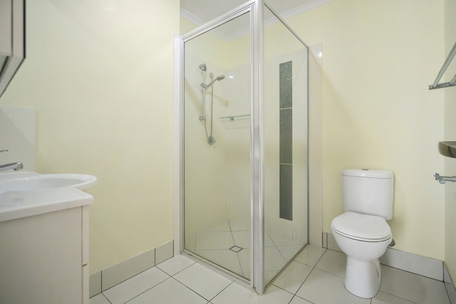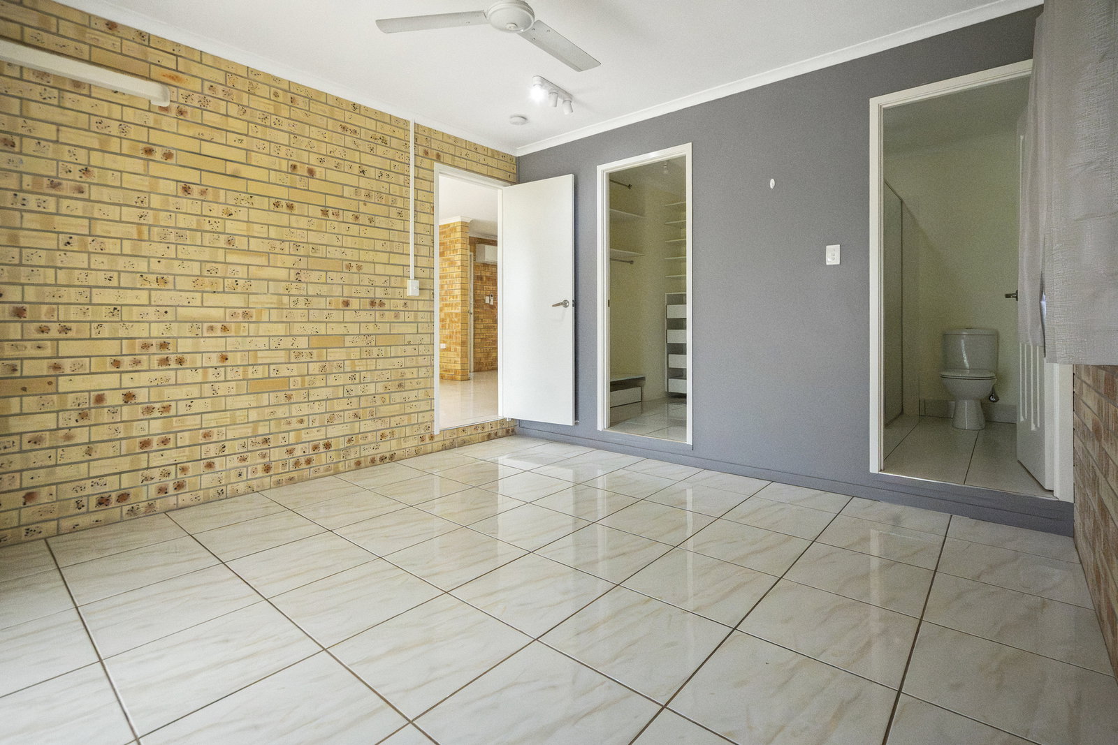 The main bedroom includes air conditioning, a walk-in wardrobe and private ensuite. All bedrooms are fitted with built-in wardrobes and ceiling fans, with three generous queen-sized rooms and a fourth large single bedroom. A large air-conditioning unit in the dining area services the main living spaces effectively.