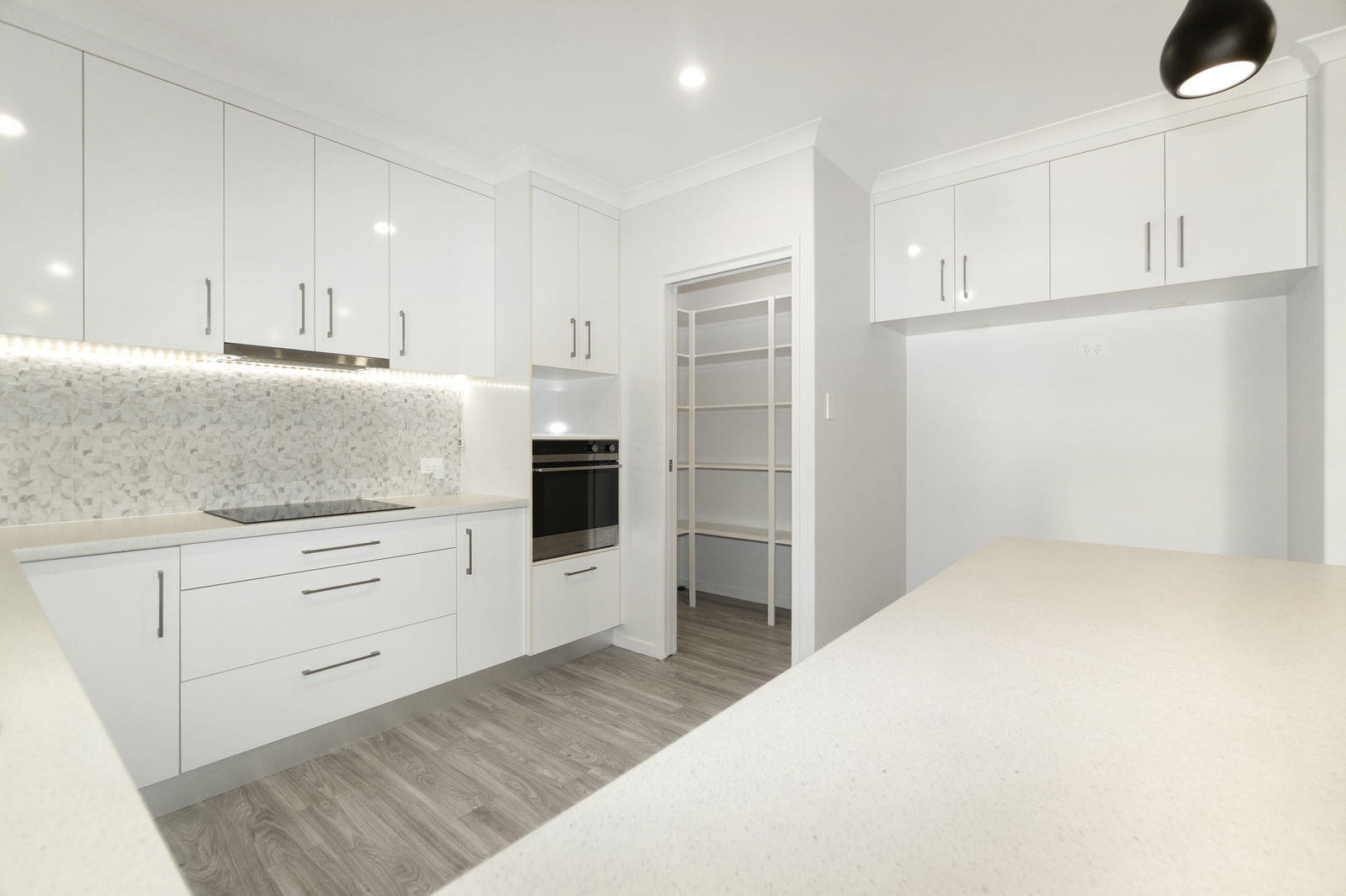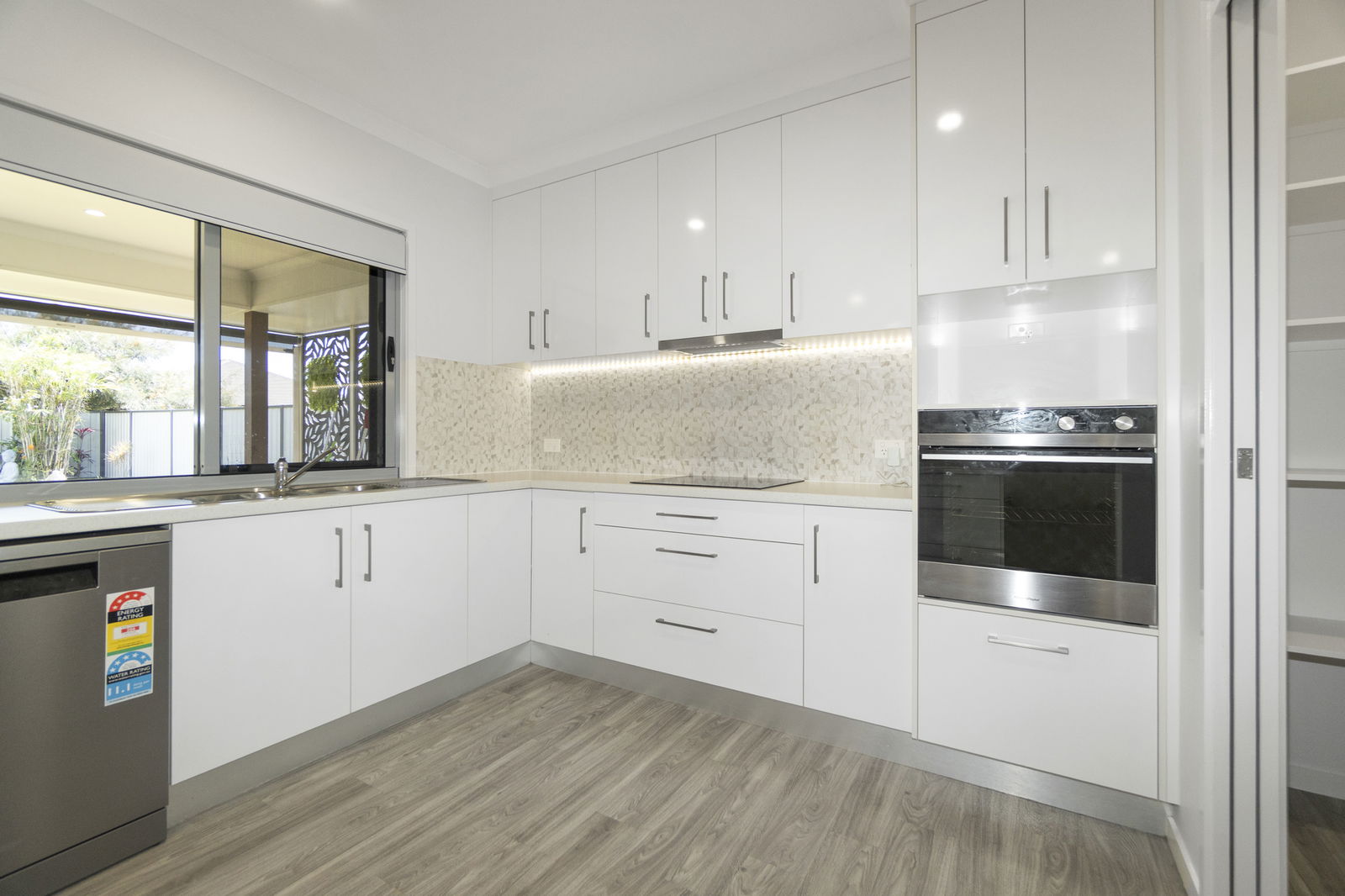 Step inside to find a spacious open-plan design with high-quality vinyl plank flooring throughout for easy cleaning. The modern kitchen features a walk-in pantry, wall oven, electric cooktop, large fridge cavity, and a central island bench with seating, along with a servery window that opens directly to the outdoor entertaining space.