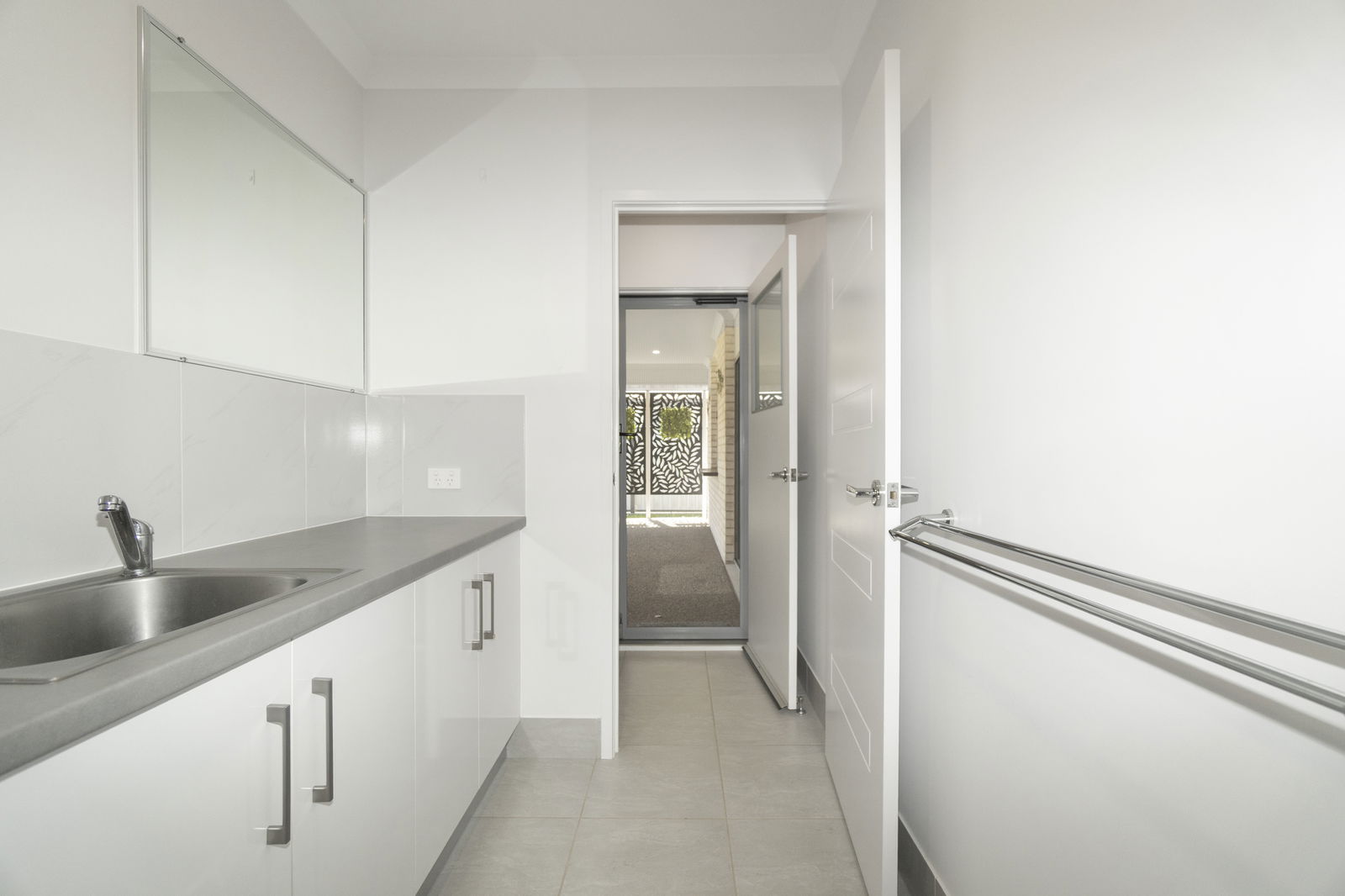 The master bedroom is fitted with air conditioning, a ceiling fan and a large built-in wardrobe, while the bathroom includes a bathtub, separate toilet, and practical features like a niche and grab rails in the shower.