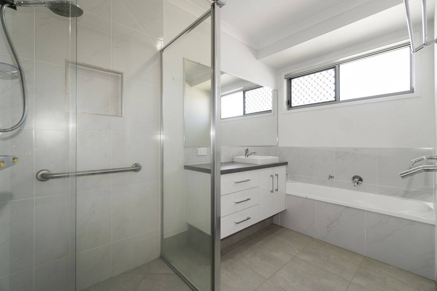The master bedroom is fitted with air conditioning, a ceiling fan and a large built-in wardrobe, while the bathroom includes a bathtub, separate toilet, and practical features like a niche and grab rails in the shower.
