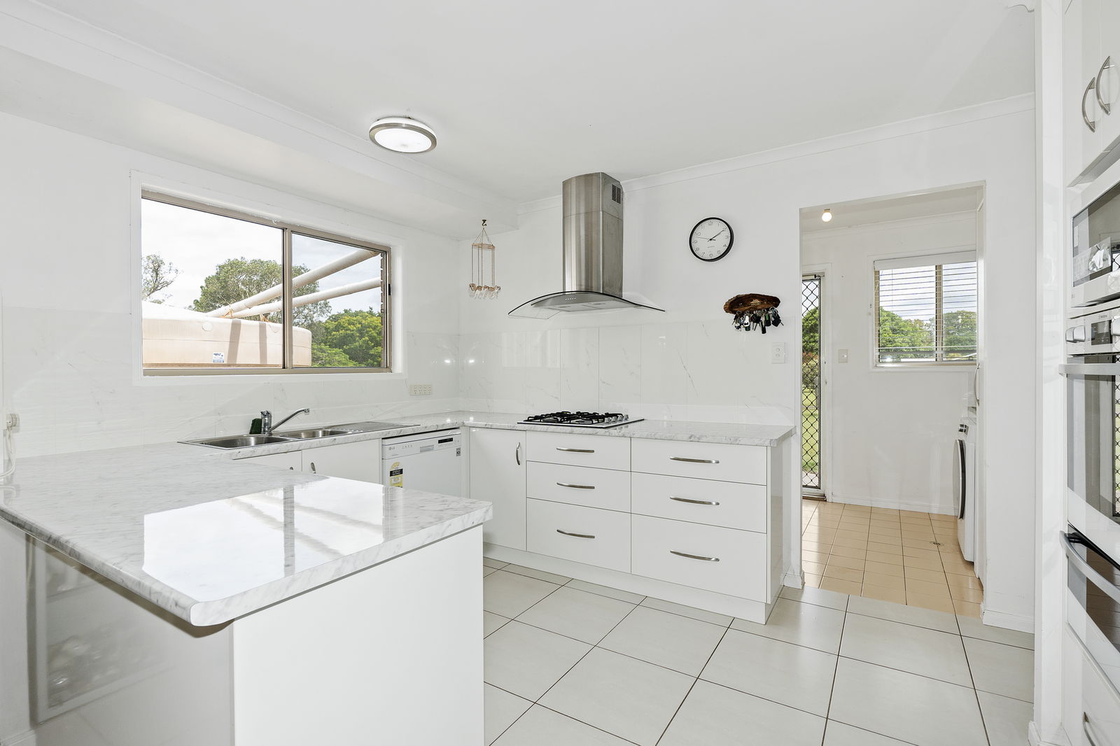 • Functional C-shaped kitchen with gas cooktop, dishwasher, waist-height oven and double door pantry