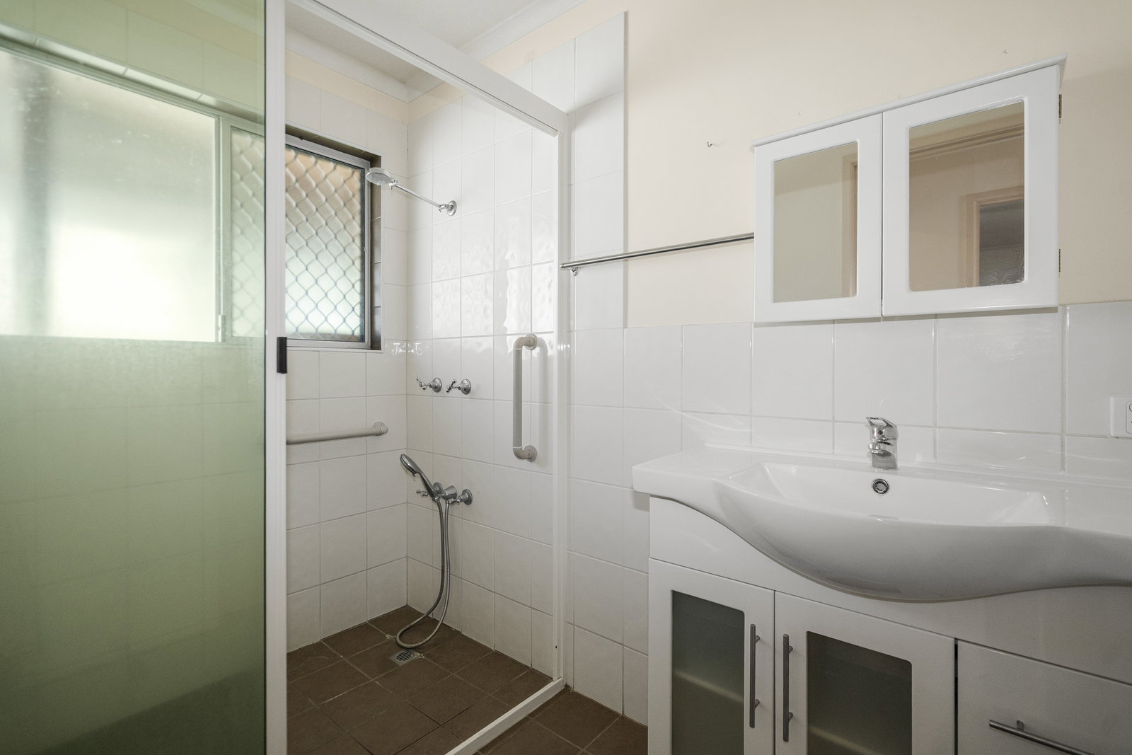 All three bedrooms are carpeted and include built-in wardrobes and ceiling fans, with the main bedroom also featuring air conditioning for added comfort. The bathroom is well-appointed with a shower, glass screen and additional storage, along with a separate toilet for convenience.