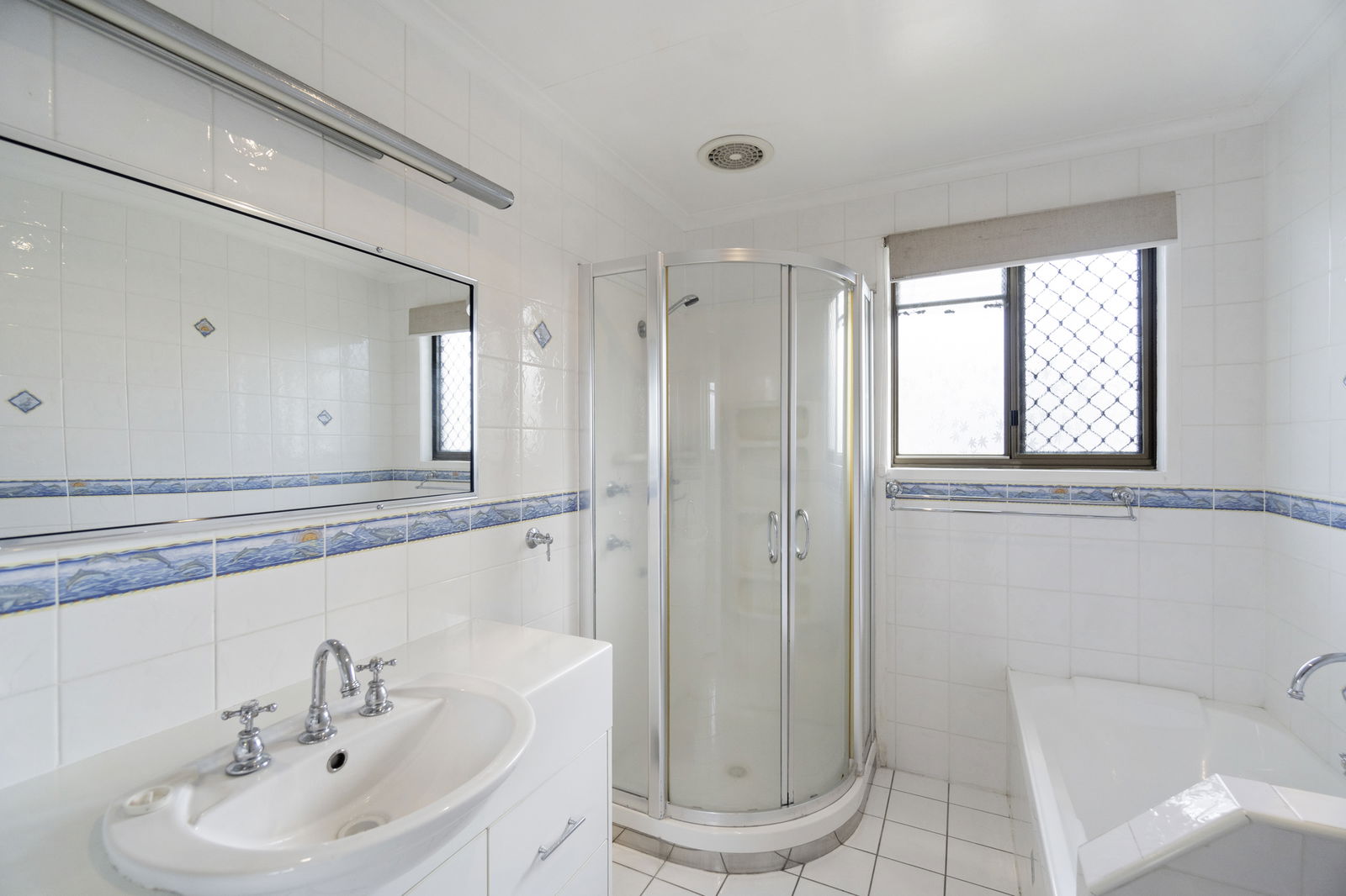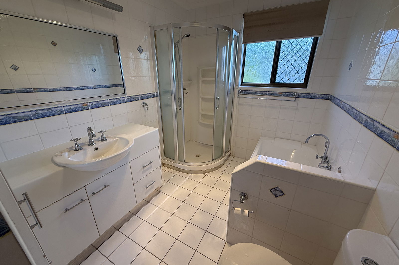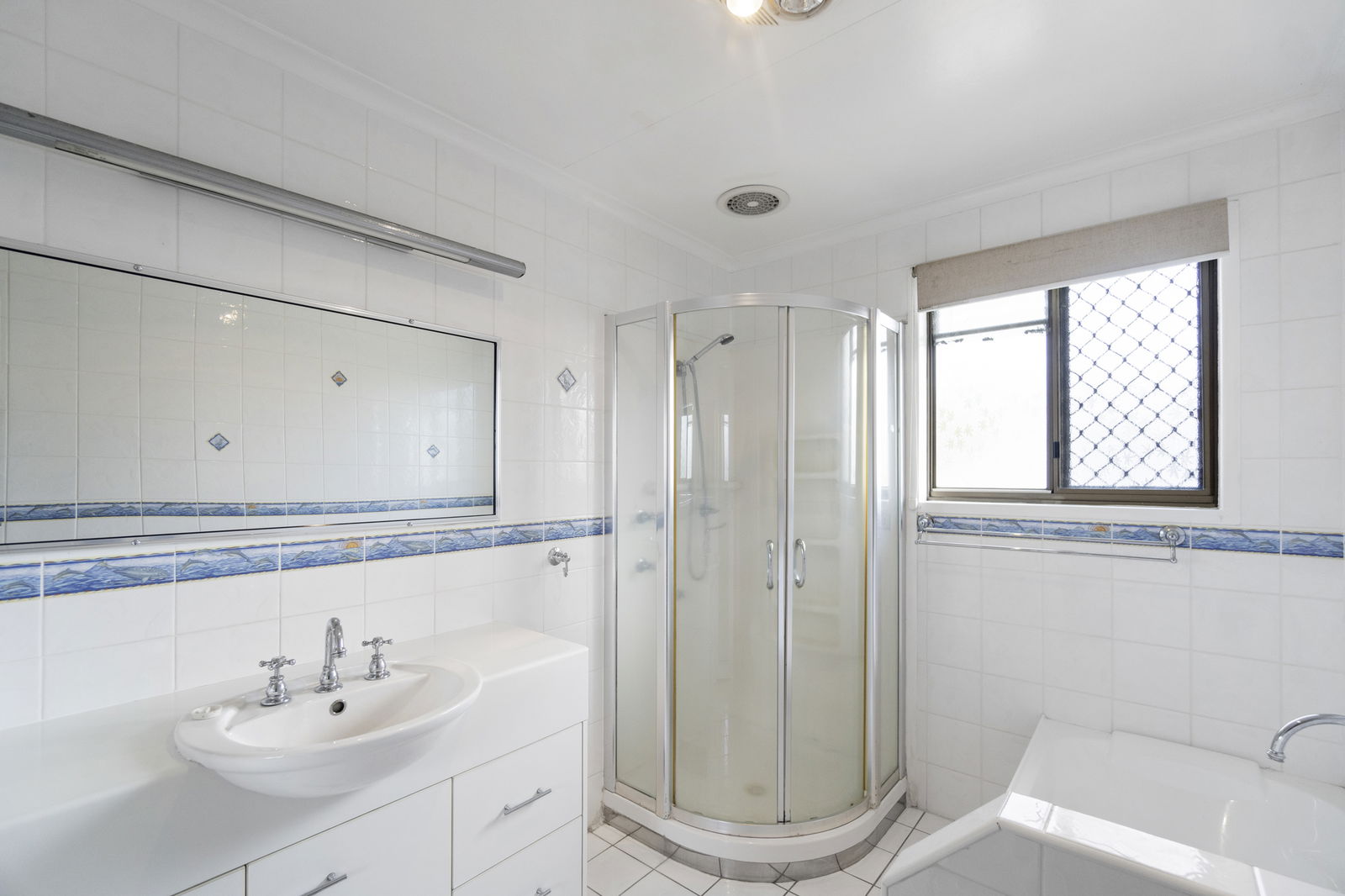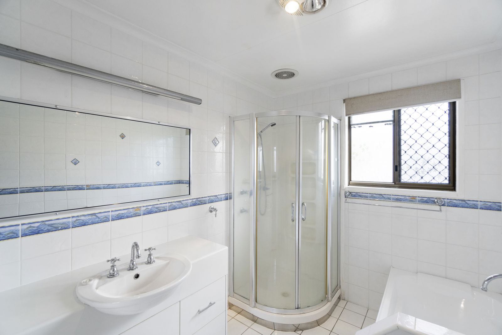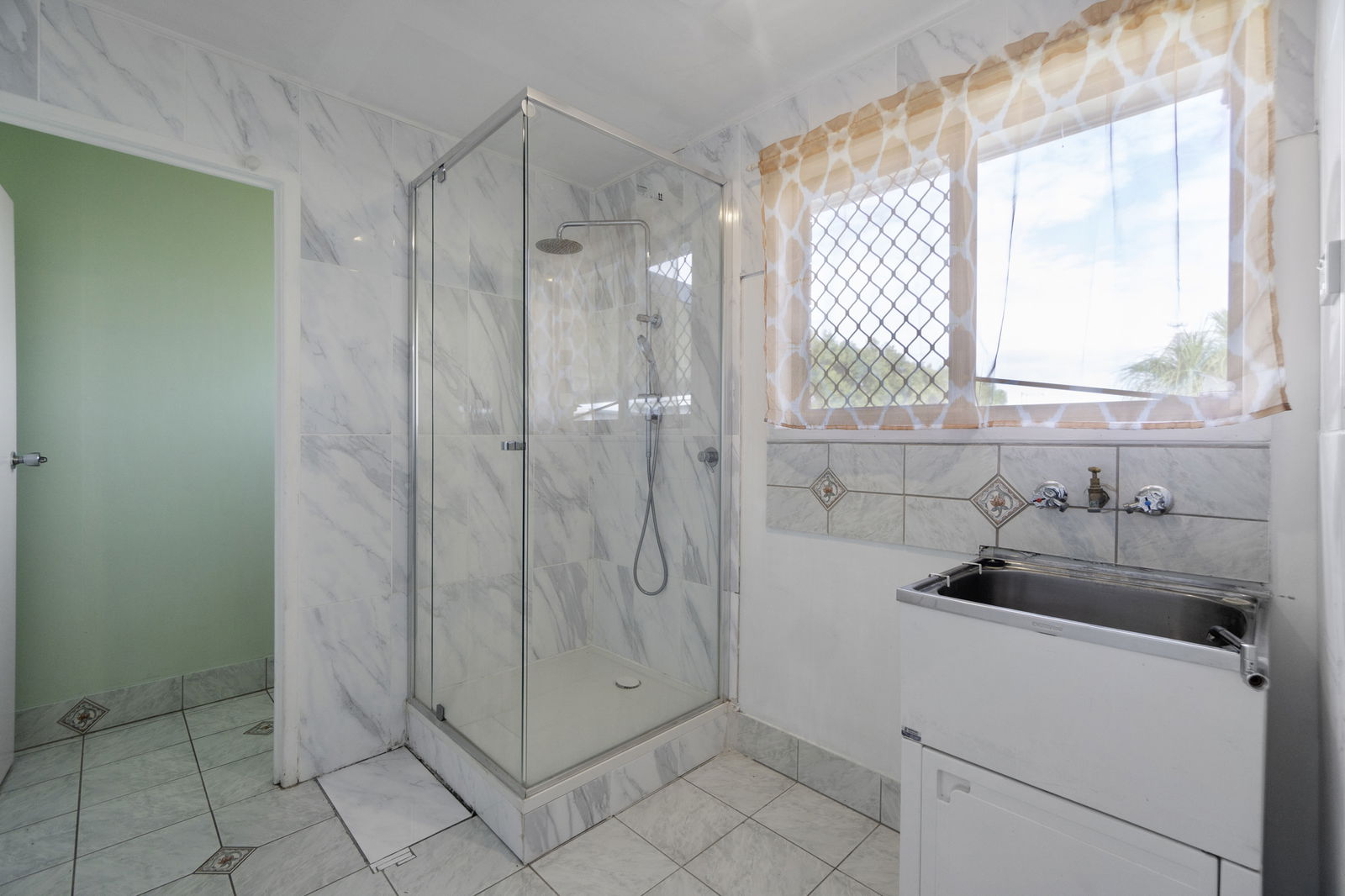 The home features a welcoming lounge area leading into the air-conditioned kitchen and dining space, complete with ample cupboard storage. There are two bathrooms, with the main bathroom offering a separate bath, corner shower, and toilet, while an second shower is located in the laundry.