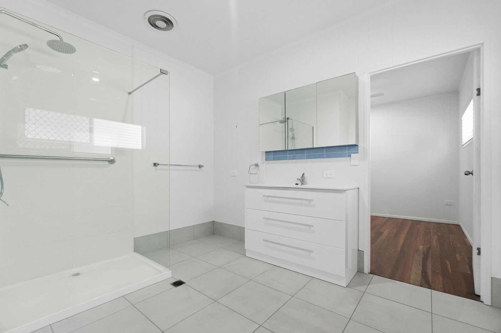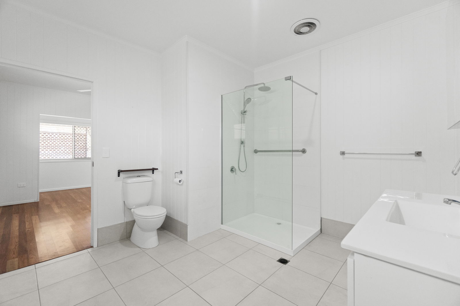 - Thoughtfully designed expansive main bathroom with contemporary finishes, including a large shower, toilet, and vanity for added functionality.