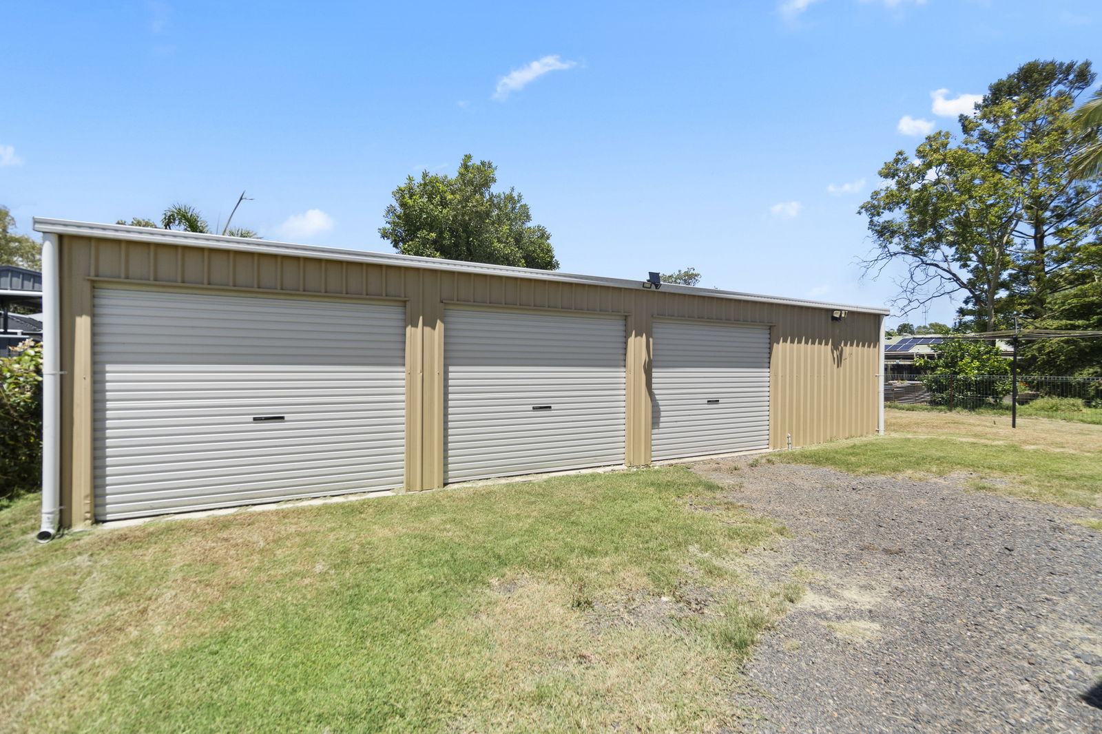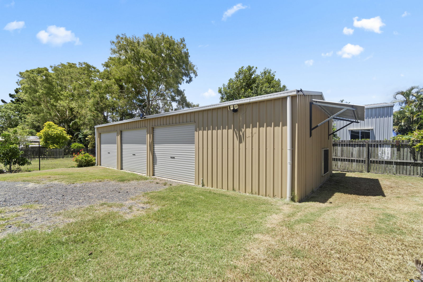 - A spacious four-bay shed offering endless possibilities. Lined and insulated, it's ideal as a secure workshop, creative studio, home gym, or an additional entertaining area.