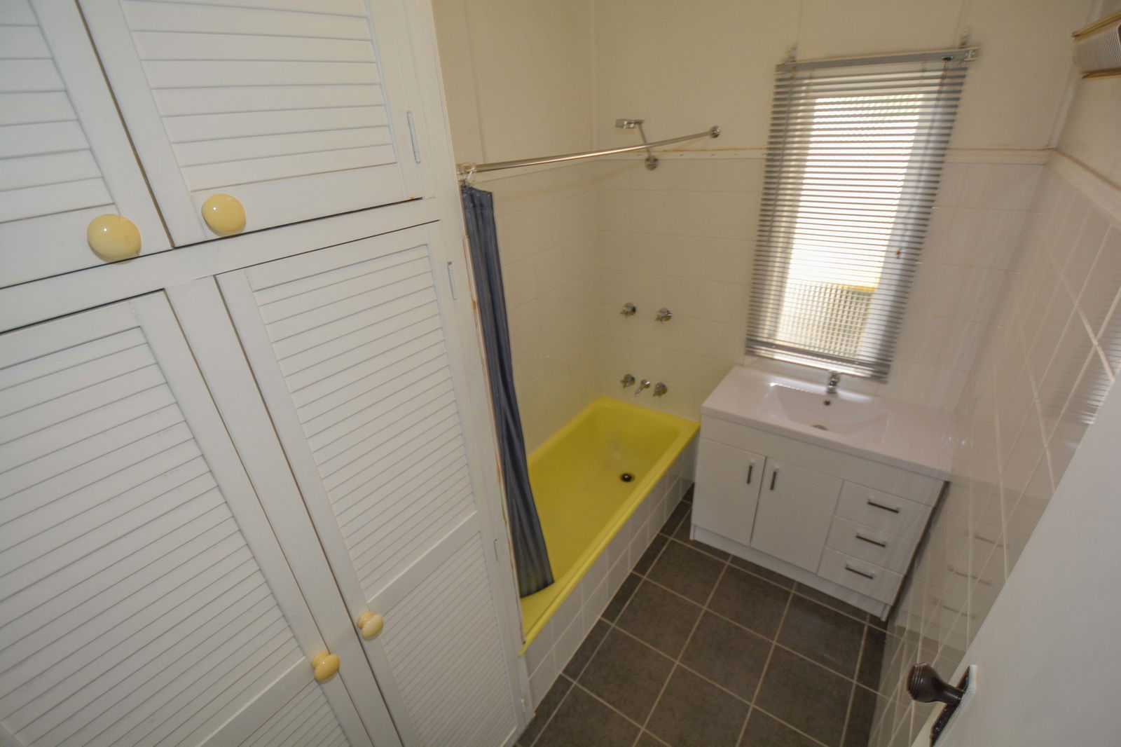 The tiled bathroom includes a shower over a full-sized tub, vanity, and built-in linen cupboard, with a separate toilet for convenience.