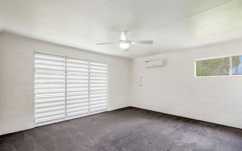Inside, the home features a light-filled open-plan living and dining area, complemented by a gallery-style kitchen designed for functionality. Air conditioning to the living area and ceiling fans throughout ensure year-round comfort, while security screens provide added peace of mind.