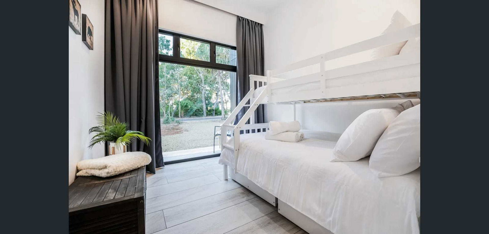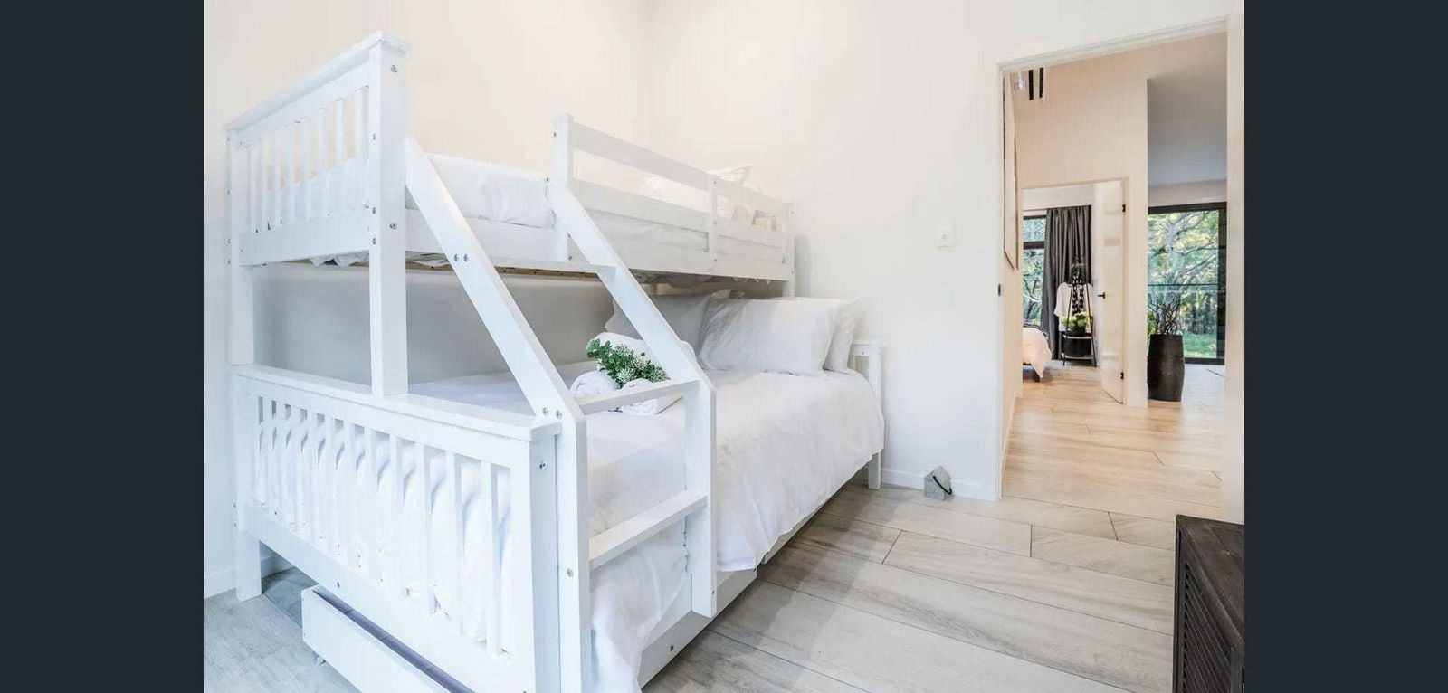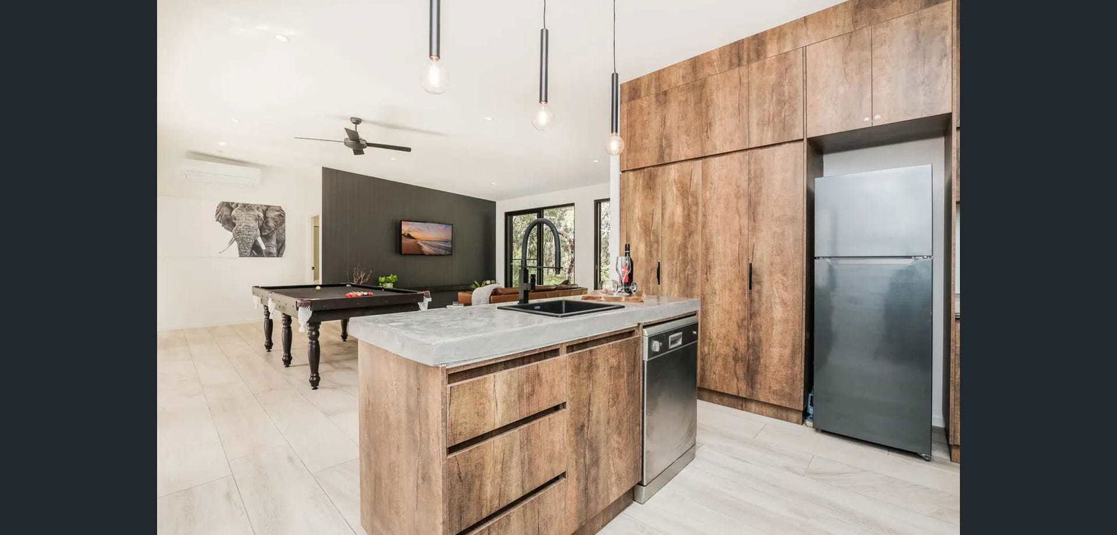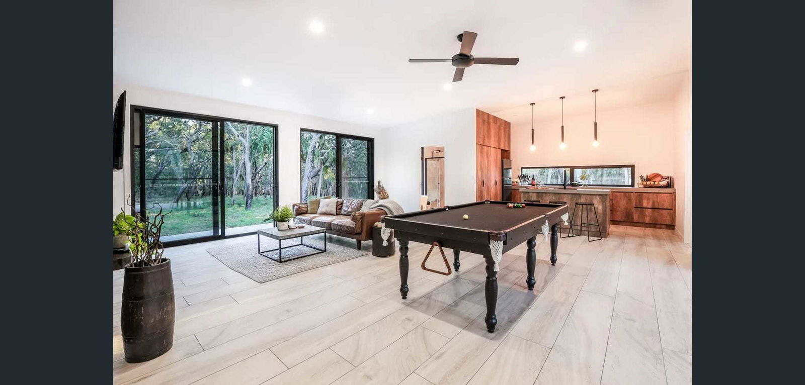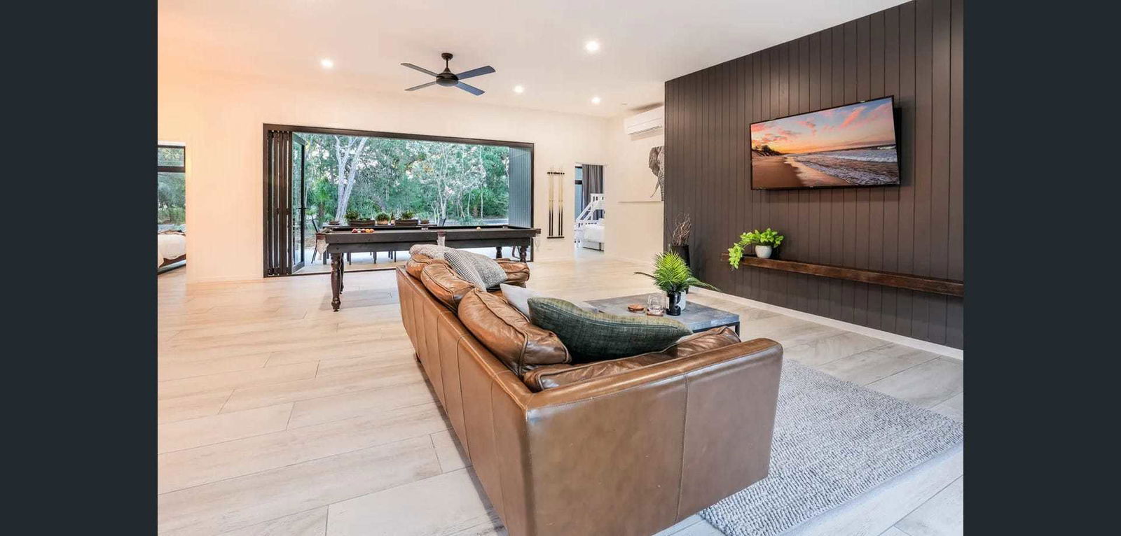 3rd bedroom with a tri-bunk - double on the bottom single on top, block out curtains and fans Open plan lounge with luxurious leather couch, air-conditioning, wall-mounted Tv and pool table for your enjoyment. Modern kitchen with full-size family fridge, dishwasher, cooktop & stove plus well-stocked crockery and utensils