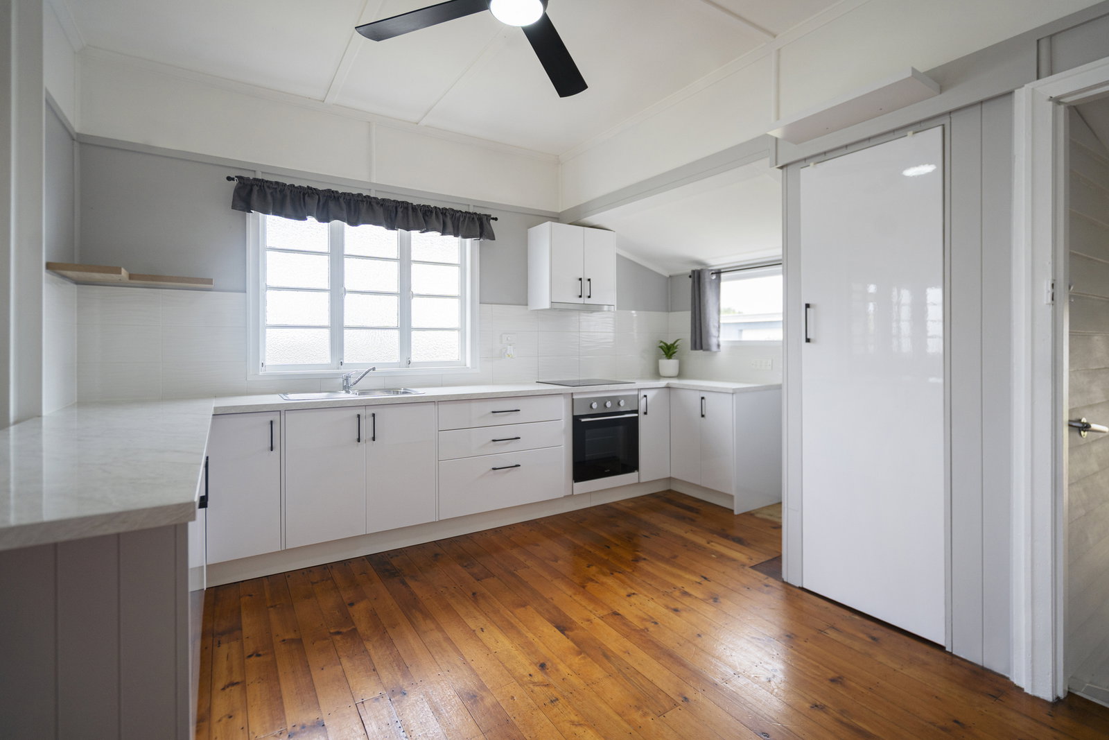 - Functional kitchen with walk-in pantry and electric cooking