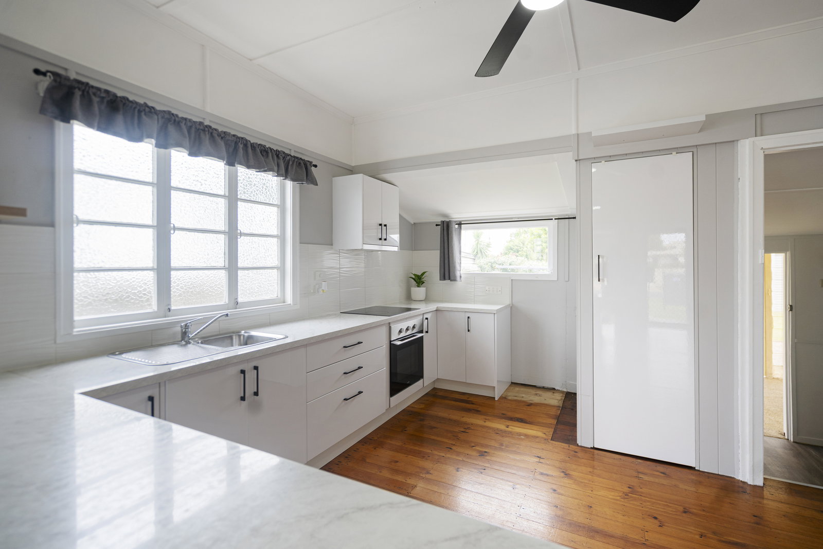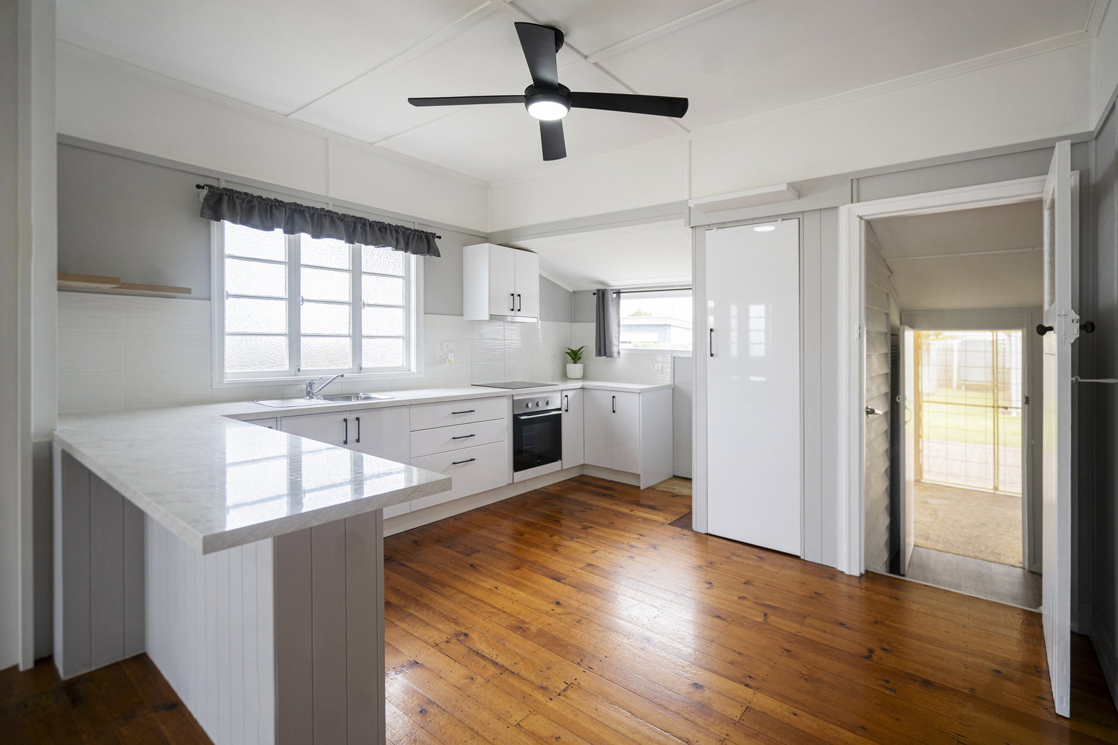 Set on a 607m² allotment, this classic Queenslander combines character features with practical updates. Inside, the home retains its charm with beautiful timber flooring through the main living area, complemented by natural light and a ceiling fan for comfort. The functional modern kitchen is well appointed with electric cooking and a generous walk-in pantry, providing excellent storage and usability.