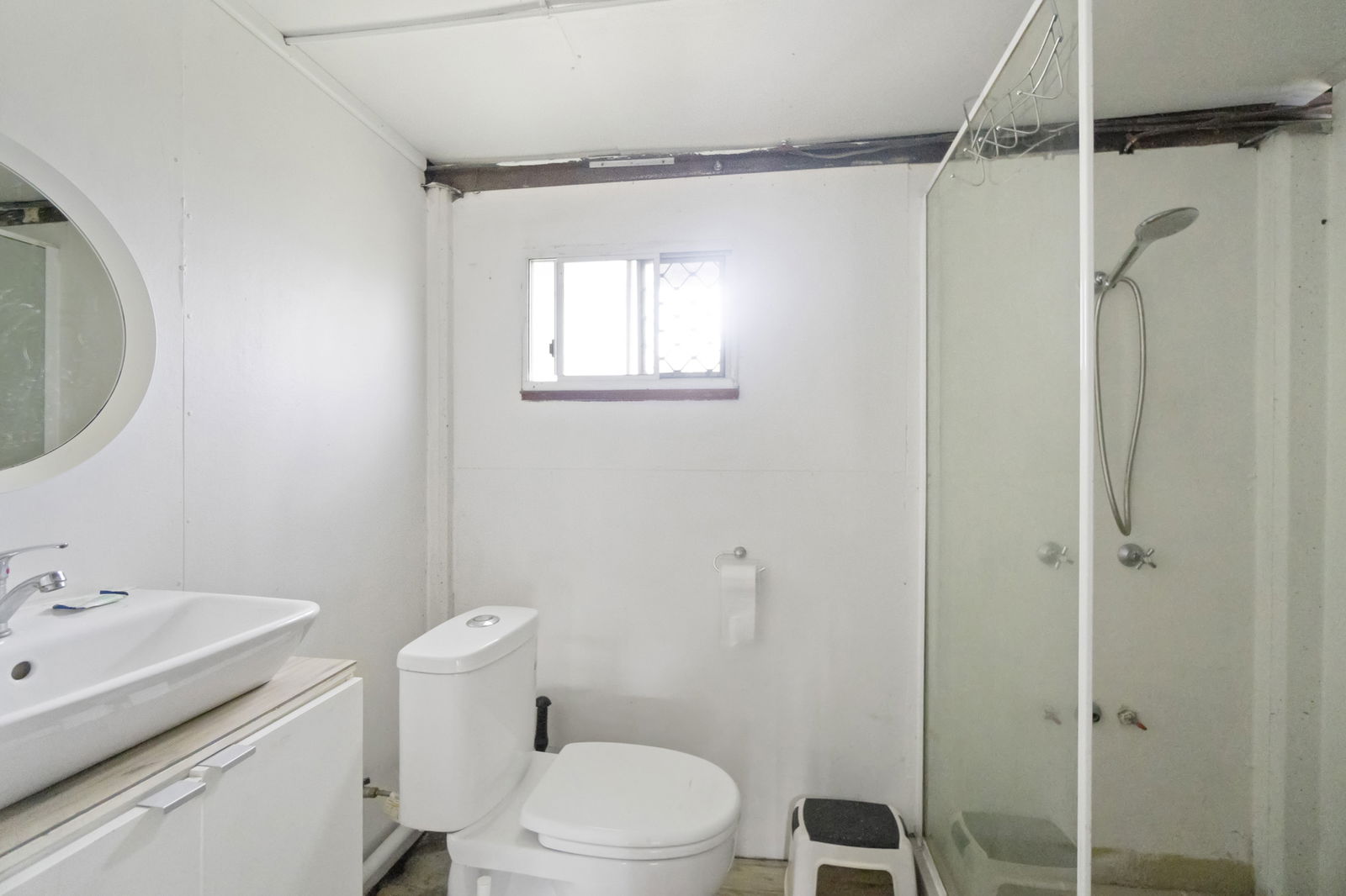 Upstairs, you'll find a bathroom with a shower and toilet, a master bedroom with a ceiling fan and wardrobe, a second bedroom with a freestanding cupboard, a third bedroom with a ceiling fan, and a fourth bedroom or office with a freestanding cupboard.