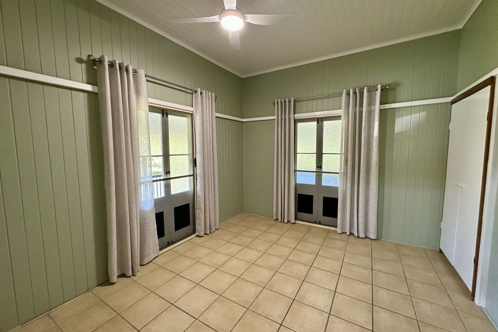 The open-plan living area is designed for comfort, with a ceiling fan and air conditioning.
