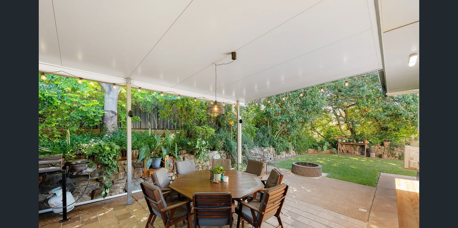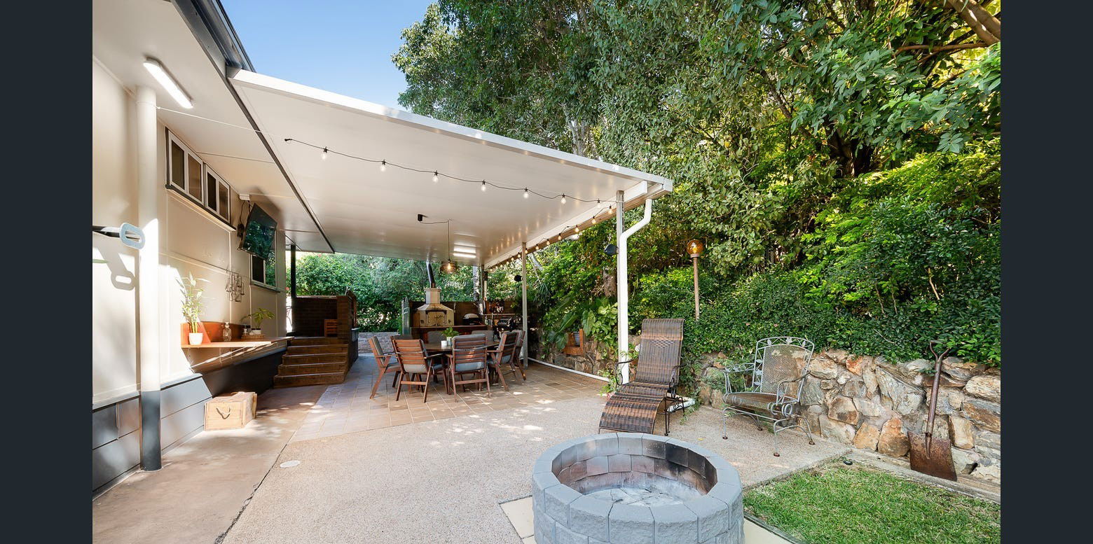 - Built-in woodfire oven, sink, benchtop prep space, and views over the landscaped yard