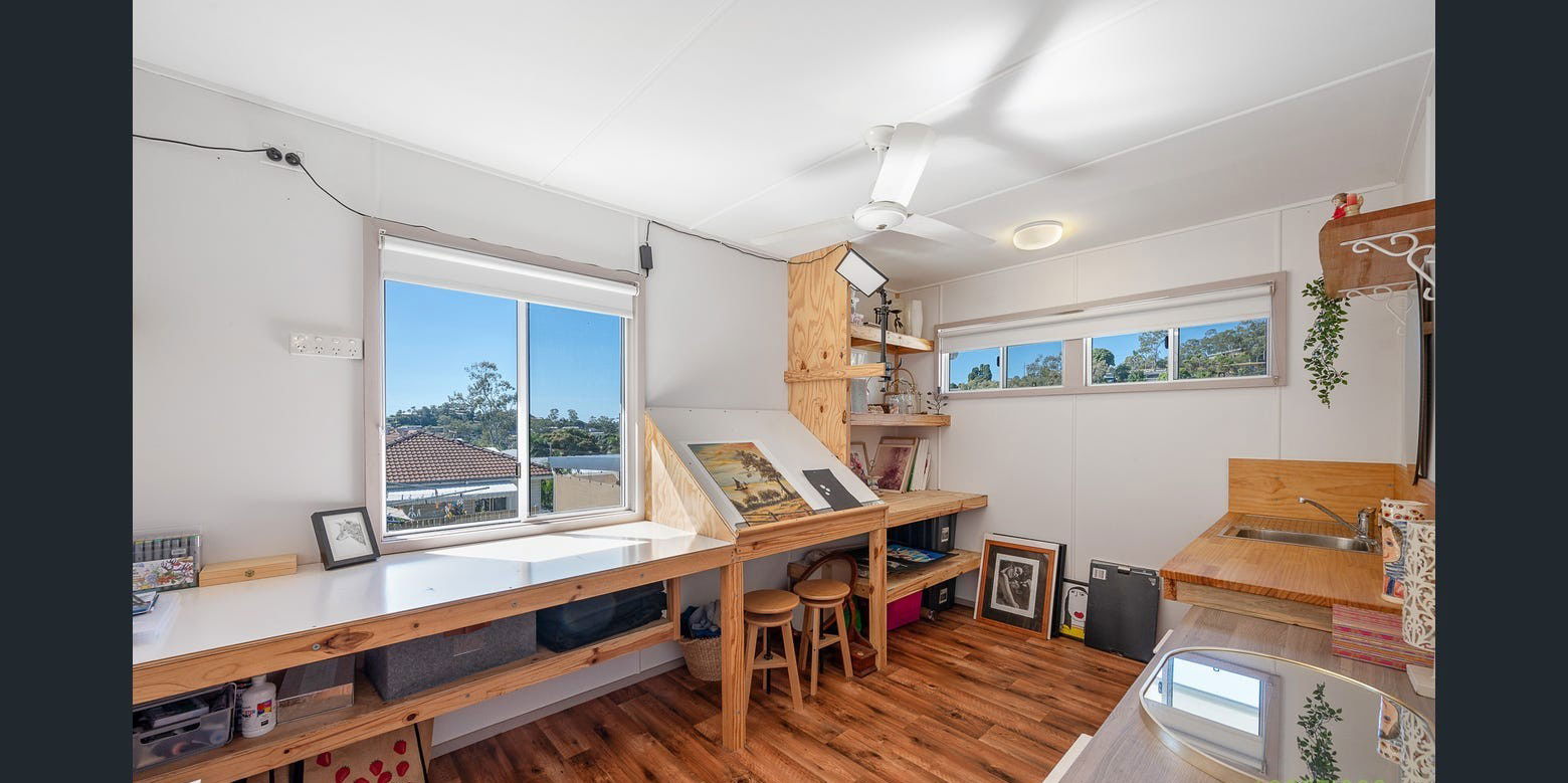 Downstairs offers a self-contained space with a bedroom, living area, laundry, and a sectioned off workshop/shed.