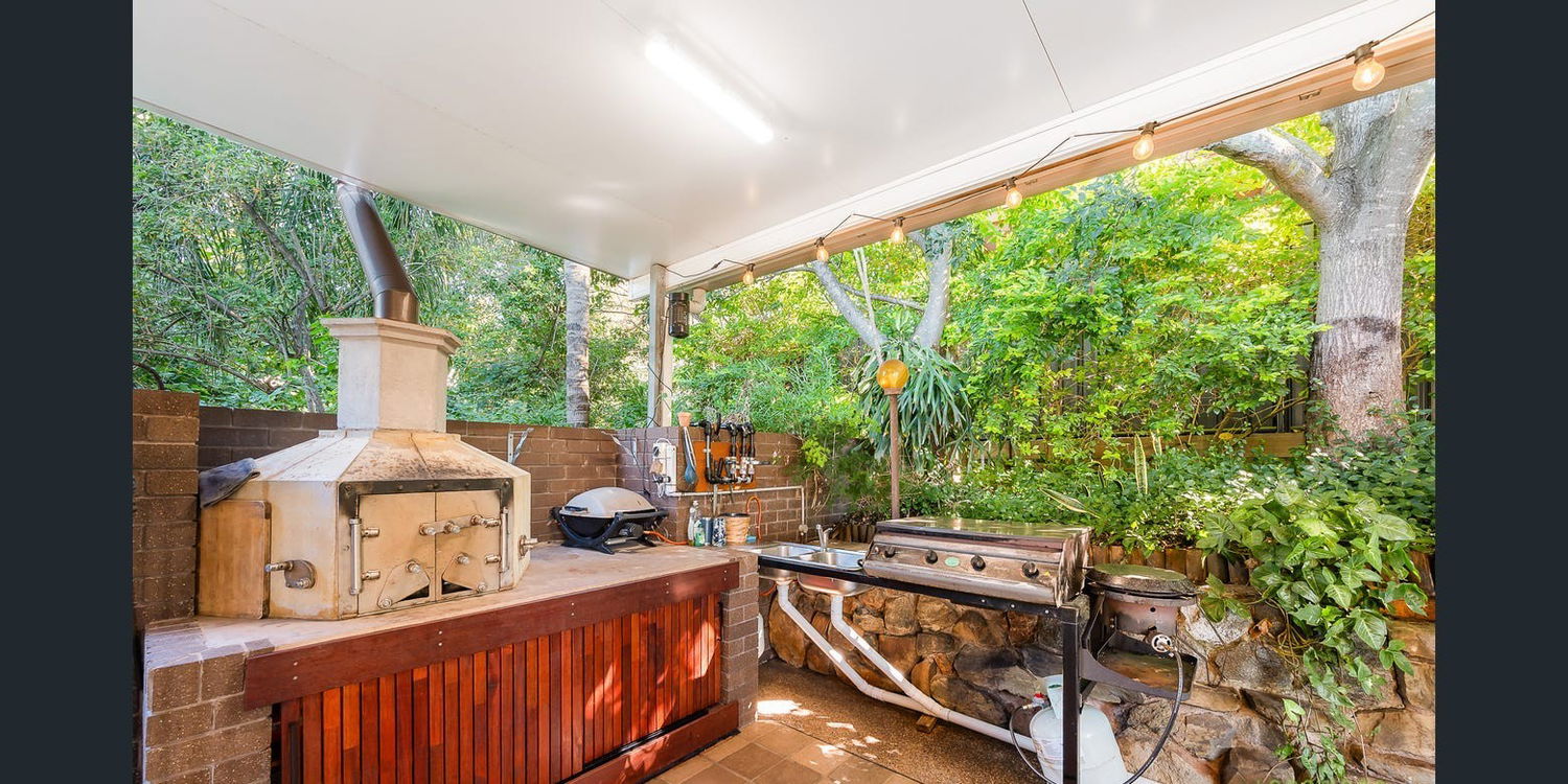 - Built-in woodfire oven, sink, benchtop prep space, and views over the landscaped yard