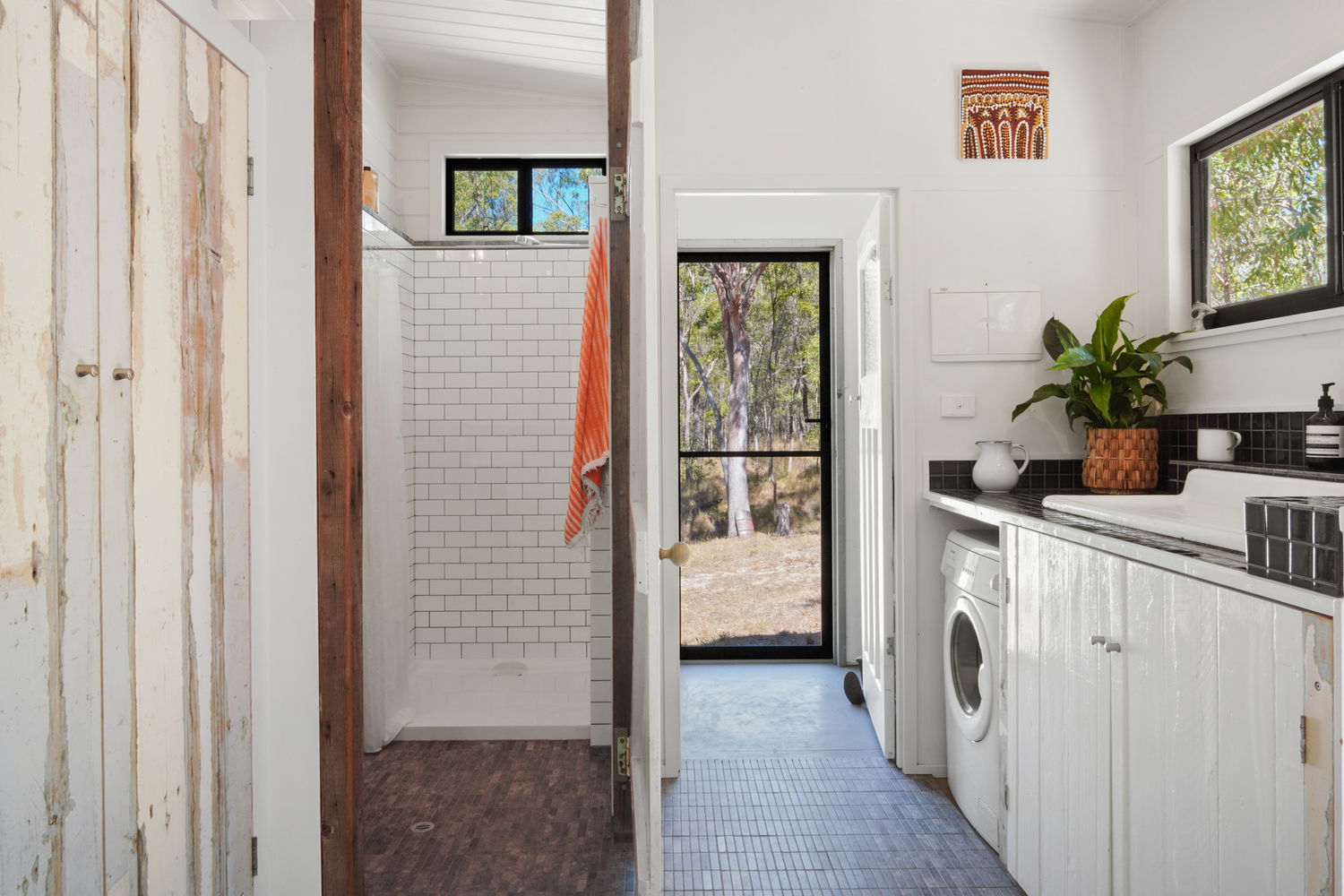 The kitchen features a gas cooktop and electric oven, complemented by a Solarhart hot water system and 2kW solar power system feeding back to the grid. An indoor bathroom is paired with two eco-friendly Green Loo toilets, plus the indulgence of an outdoor hot-water shower and bath under the stars.