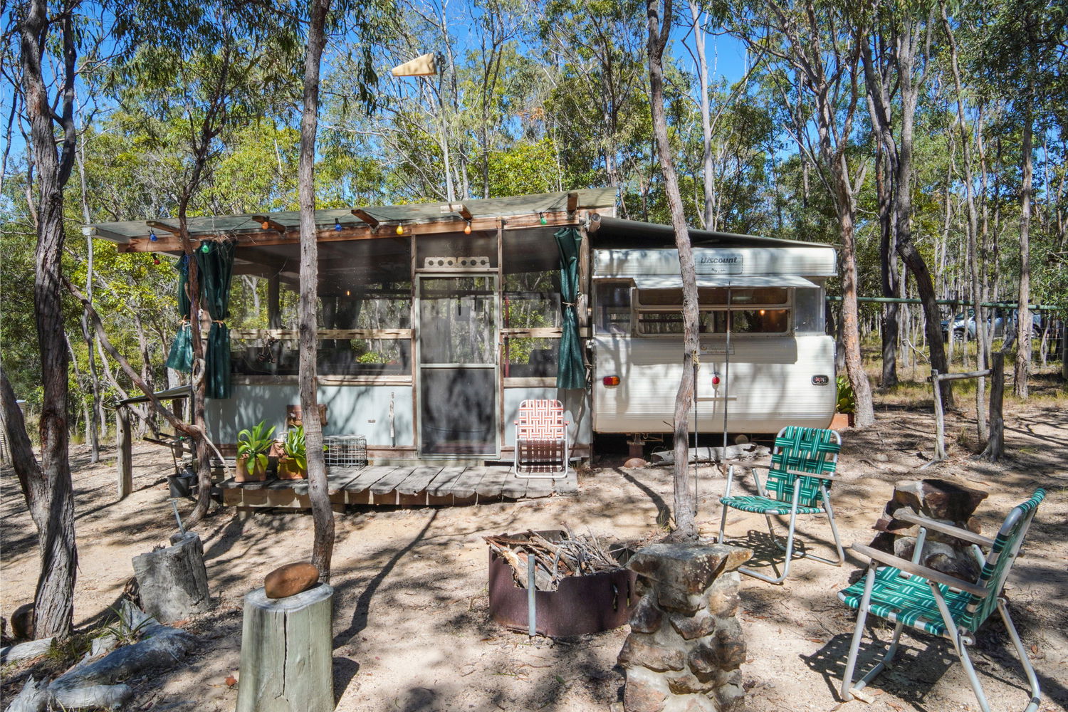 Around 60m² of decks capture winter sun, with shaded areas for summer relaxation. A 22,000L water tank services the home, while the self-contained caravan/guest house, "The Shack," offers its own 6,000L tank, kitchen, screened porch, and firepit for gatherings.