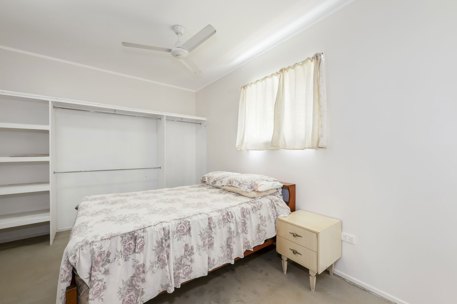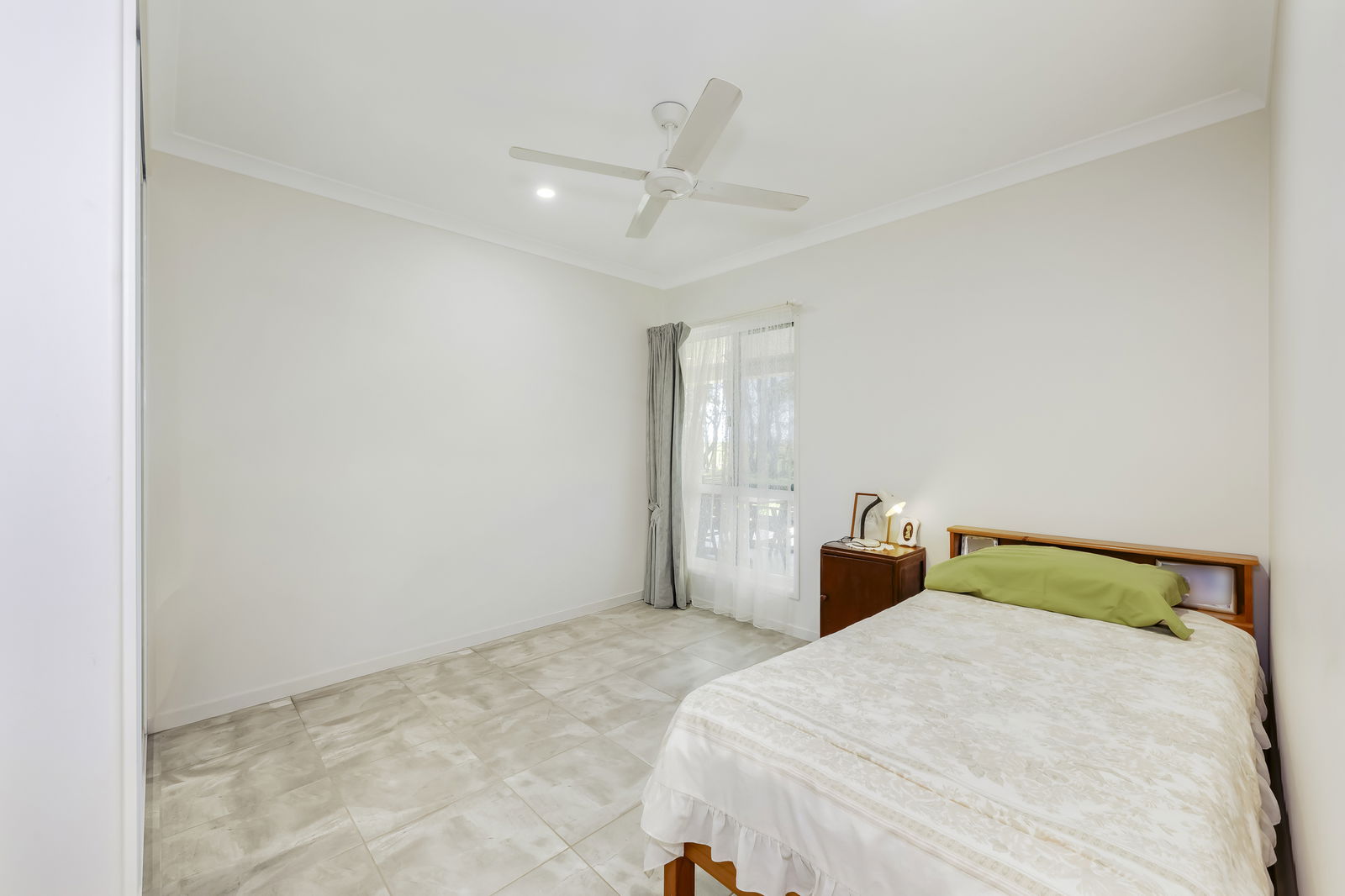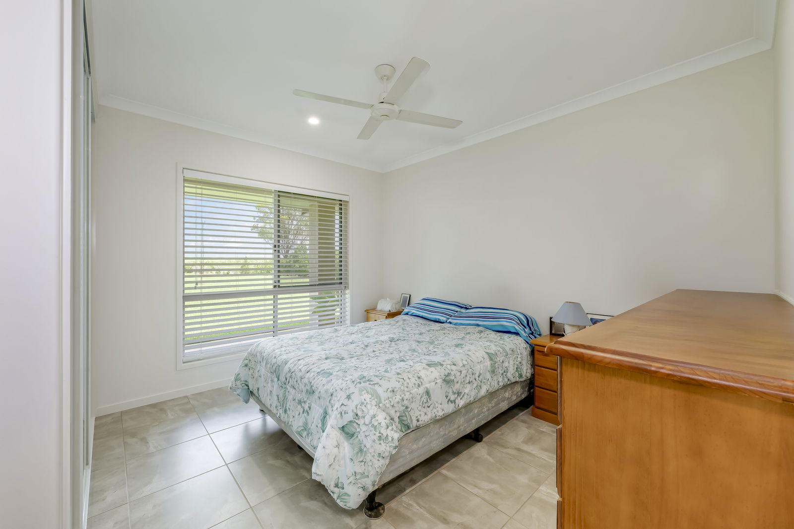 • Bedroom 2 with built-in robe, ceiling fan & tiled flooring