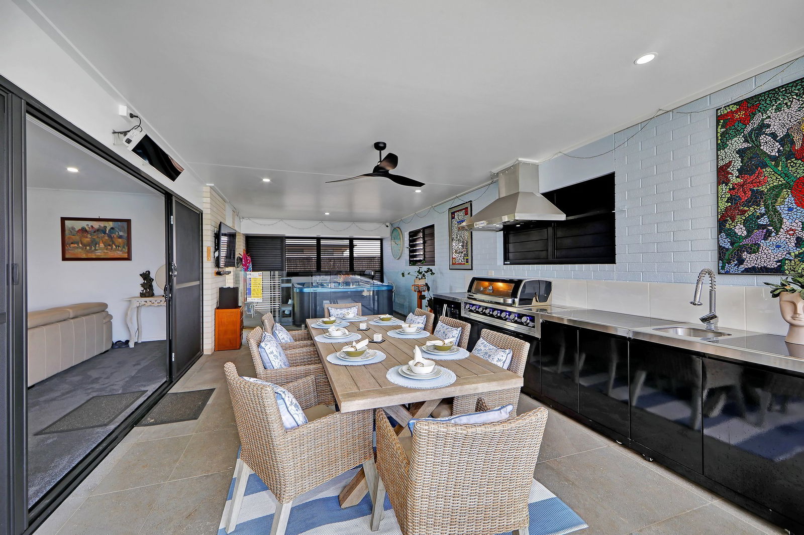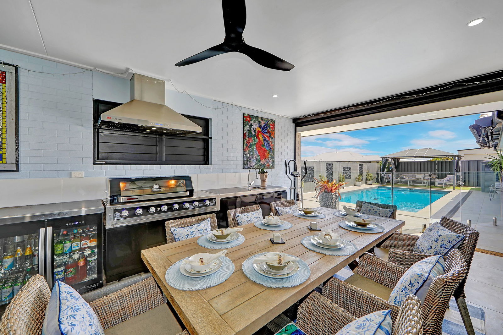 - Alfresco entertaining area with outdoor kitchen, built-in BBQ, sink, and overlooking the heated magnesium pool and spa.