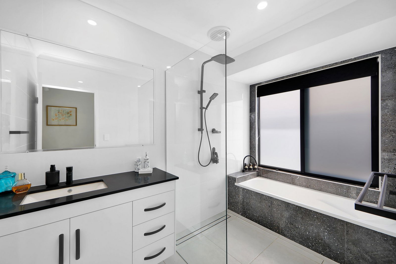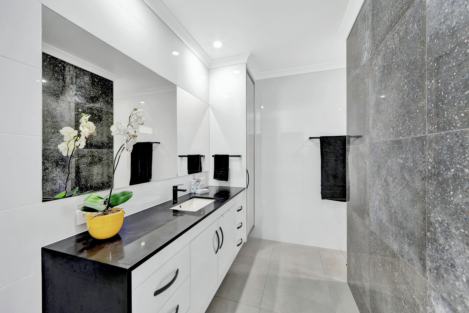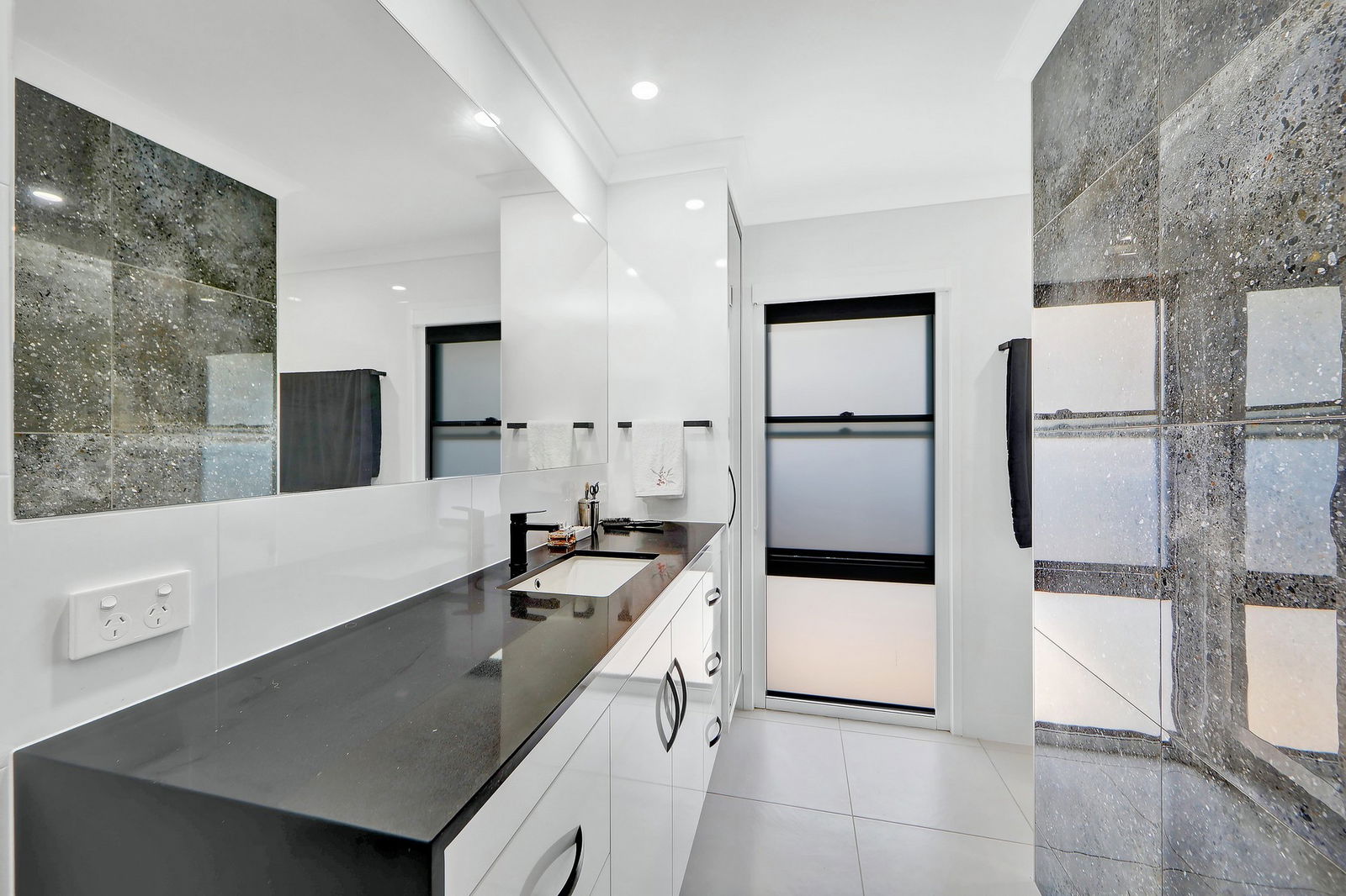 - The main bathroom presents high-end fixtures and finishes.