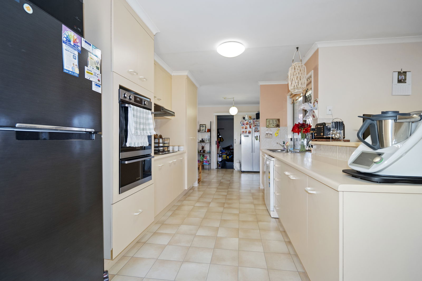 • Galley kitchen: dishwasher, gas cooktop, wall oven, floor-to-ceiling pantry, breakfast bar