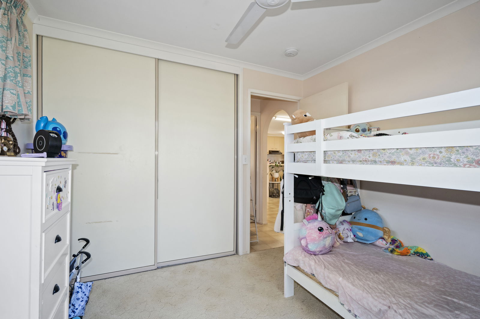 • 3 bedrooms, all with built-ins; air-conditioned main connects to a 2-way bathroom (corner shower, separate tub, wide vanity)