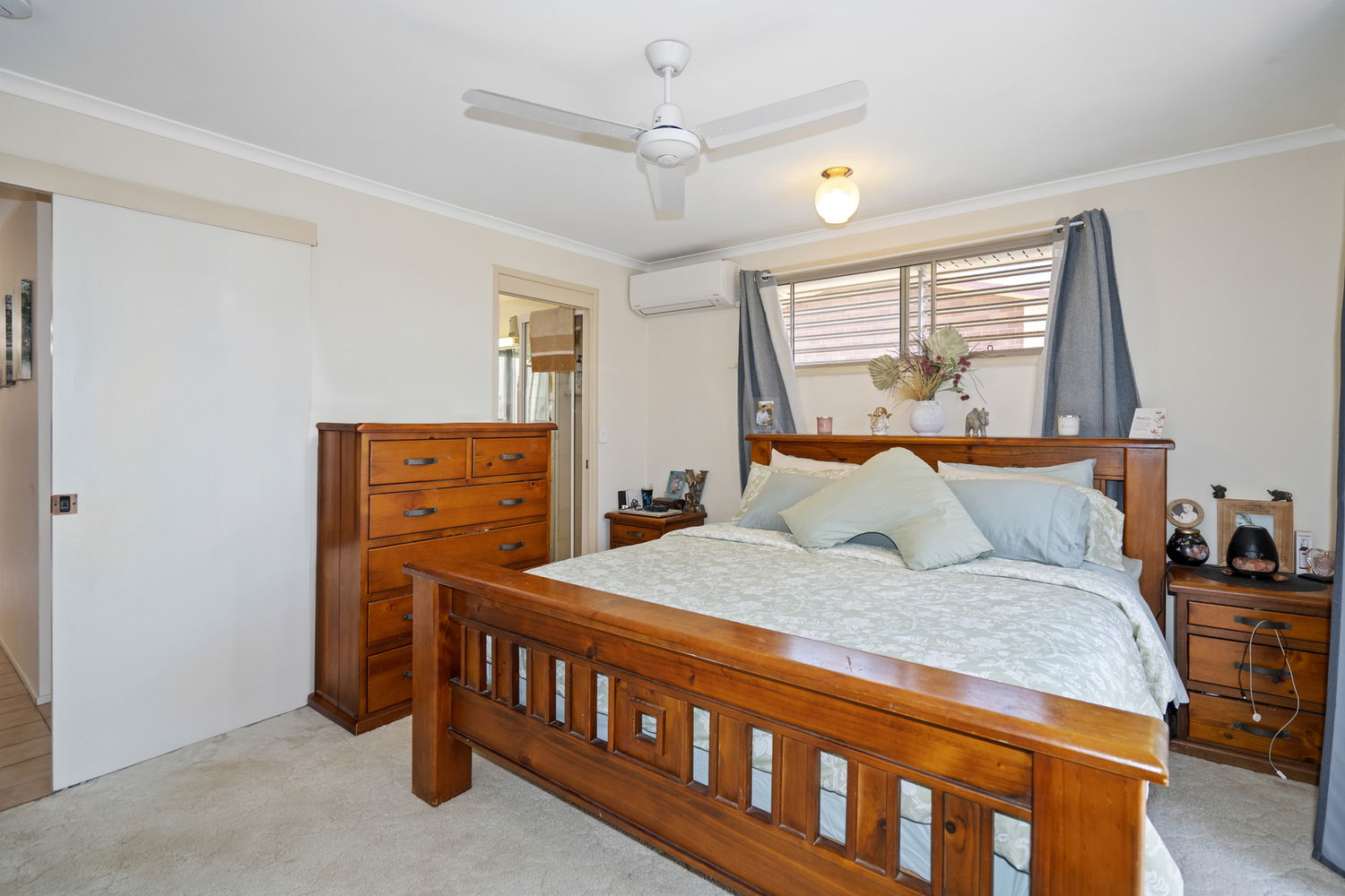 • 3 bedrooms, all with built-ins; air-conditioned main connects to a 2-way bathroom (corner shower, separate tub, wide vanity)