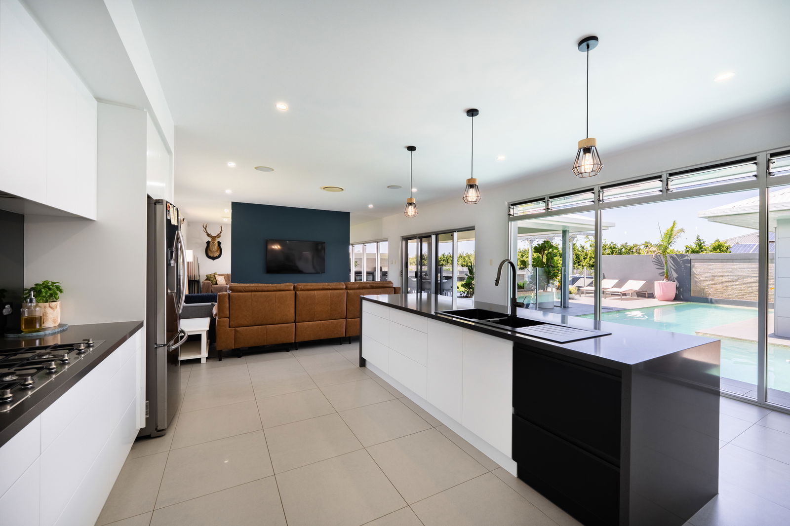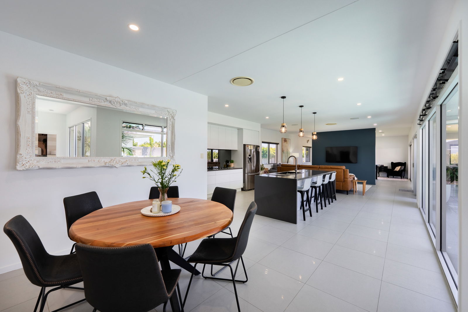 The heart of the home is an expansive open-plan kitchen, dining, and living area that flows directly to the outdoor entertaining zones: