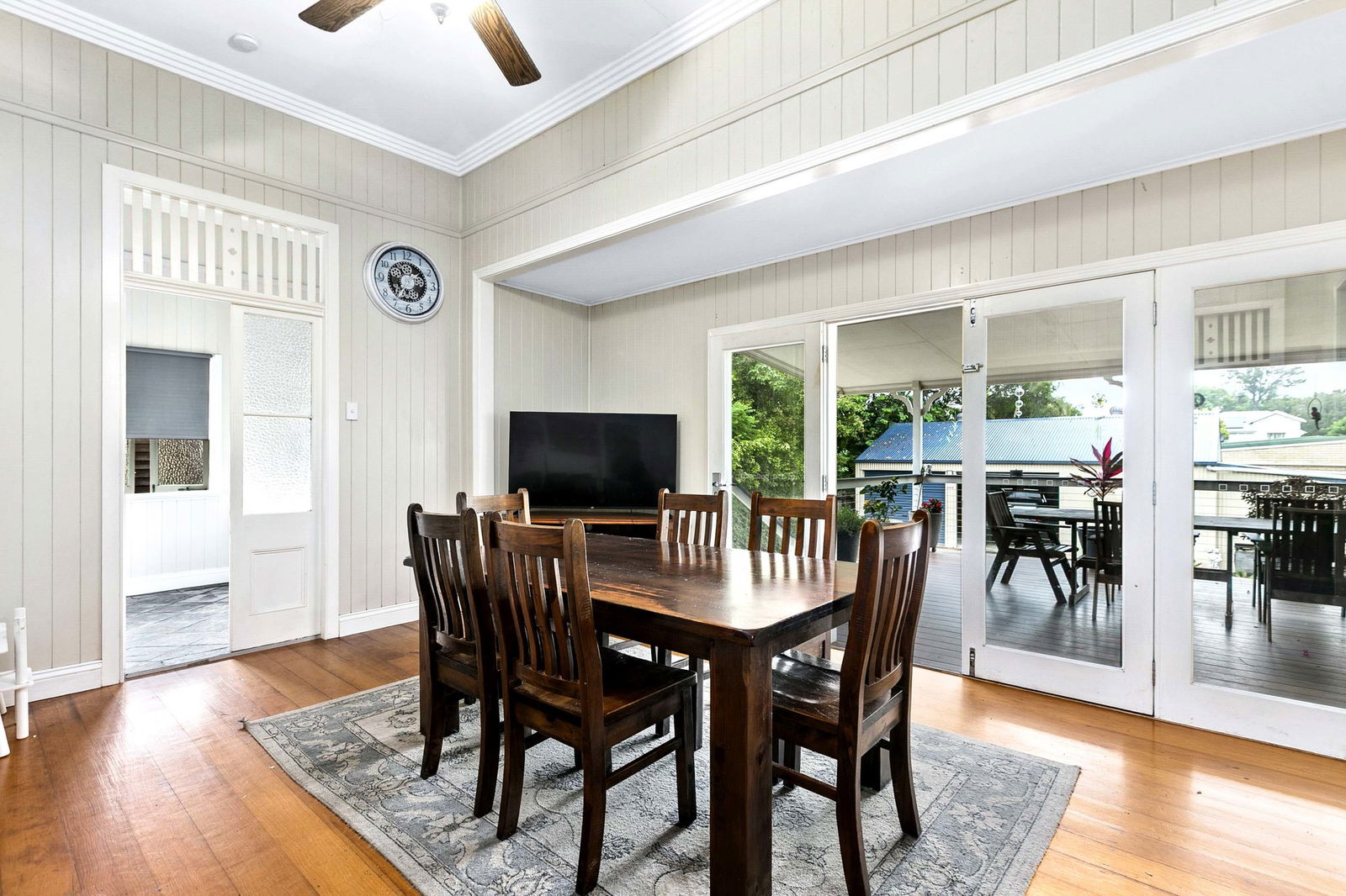 Large French doors opening to expansive rear entertaining deck