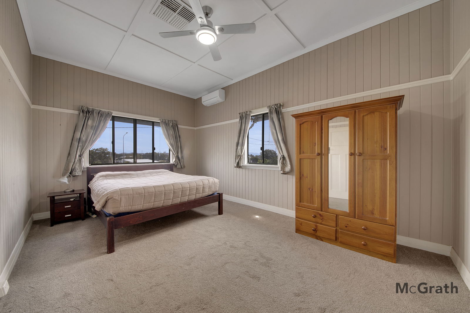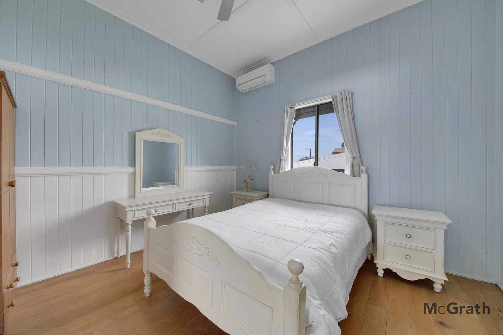 Two spacious bedrooms upstairs with stunning hardwood timber floors and air-conditioning.