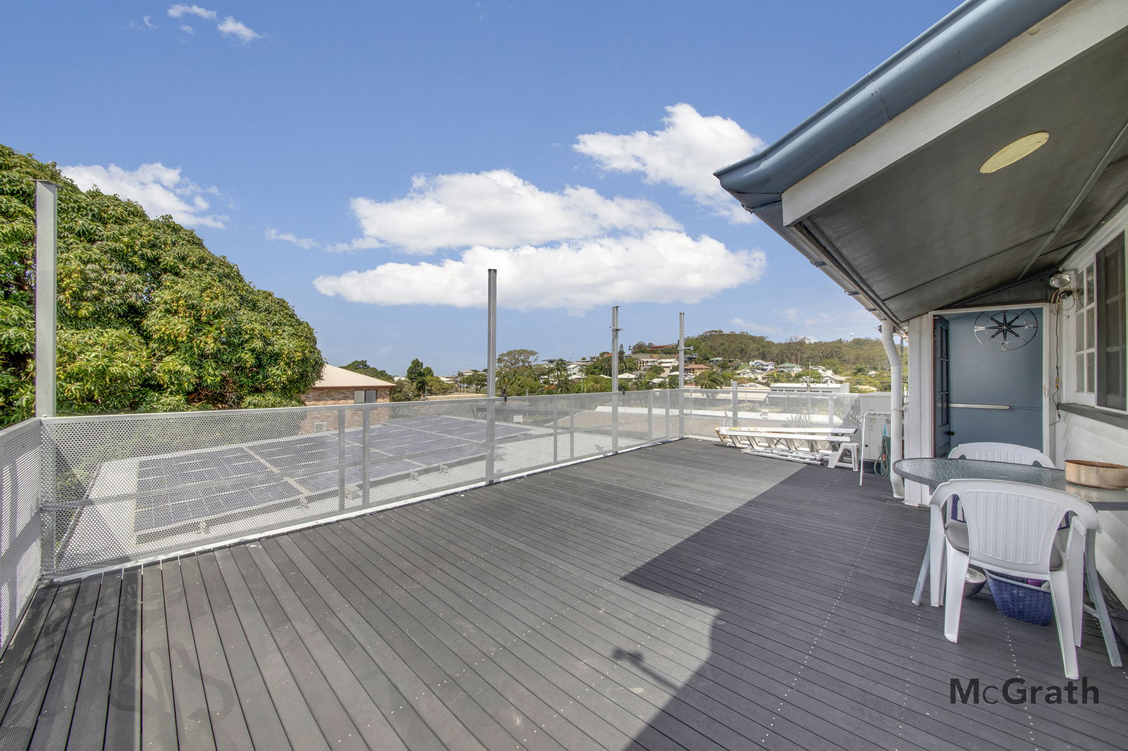 Multiple living areas plus a large outdoor entertaining deck with leafy outlooks.