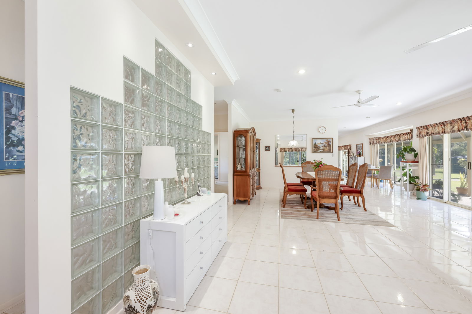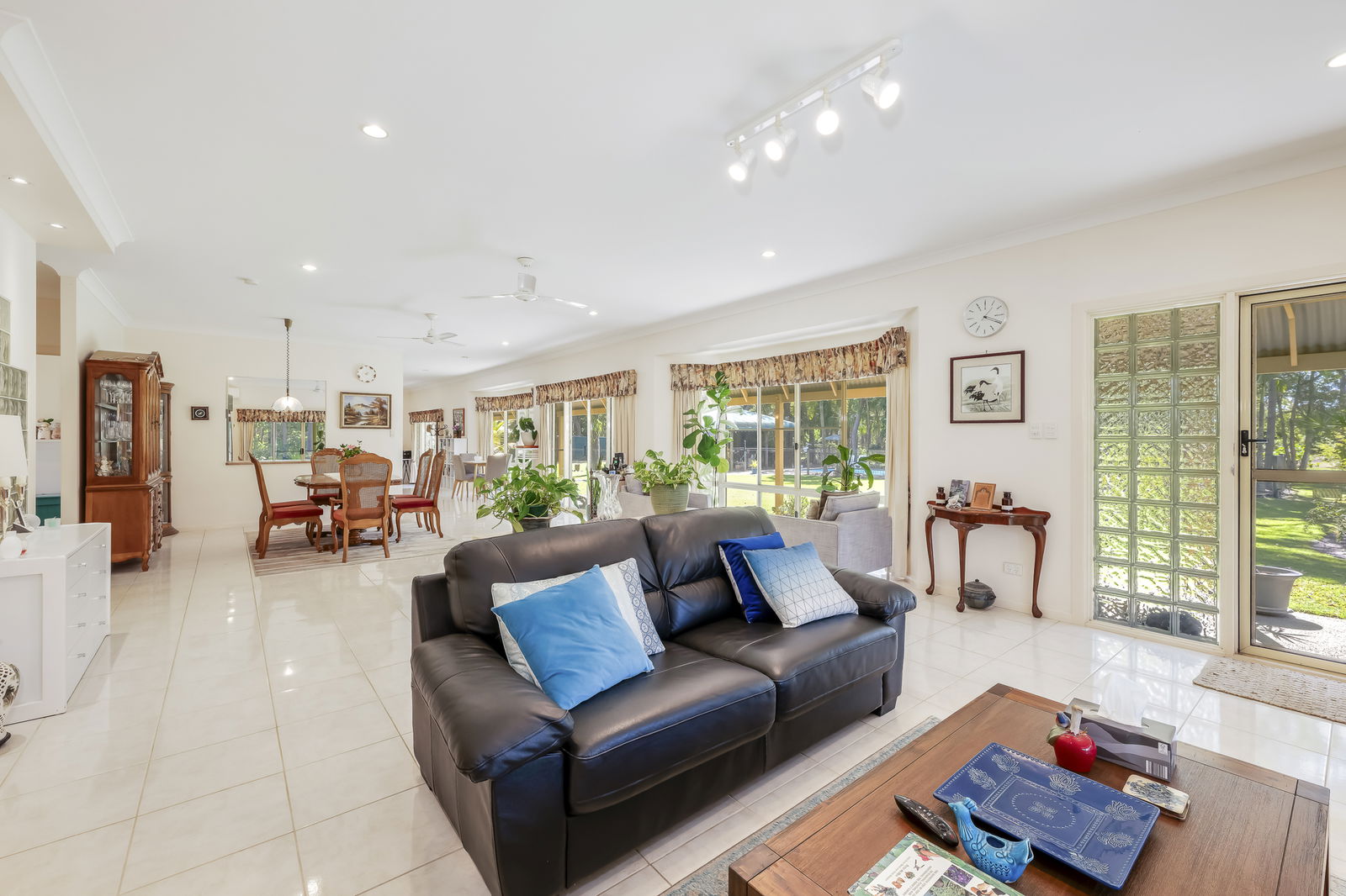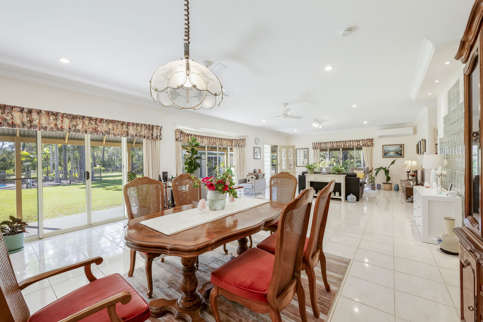 - Light-filled open-plan living area with views over the pool and cabana