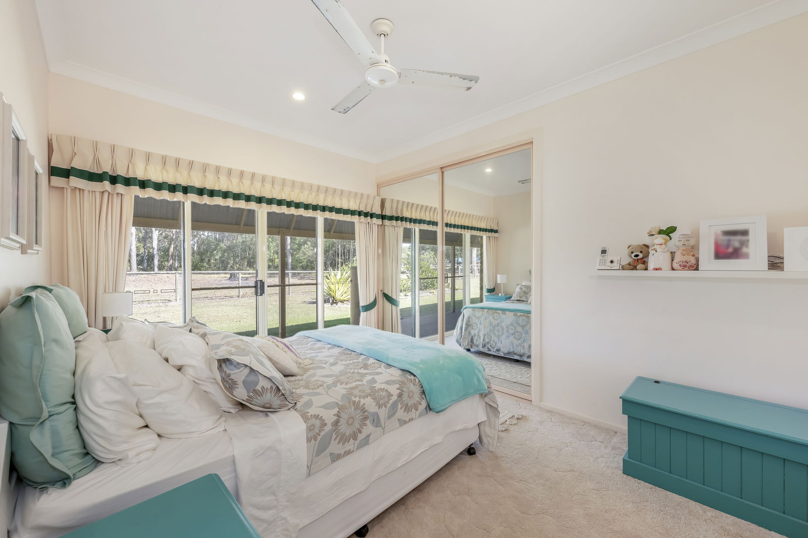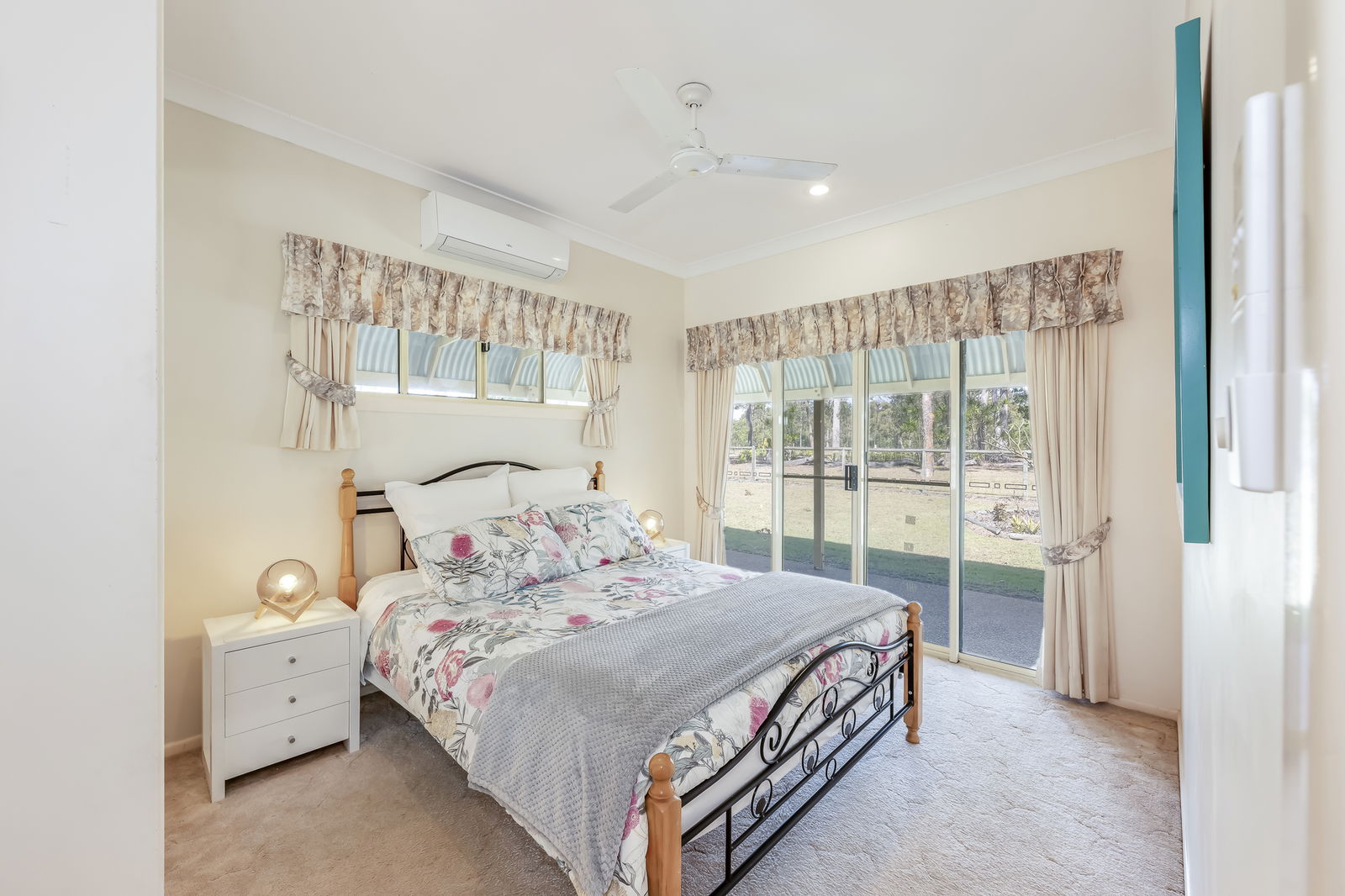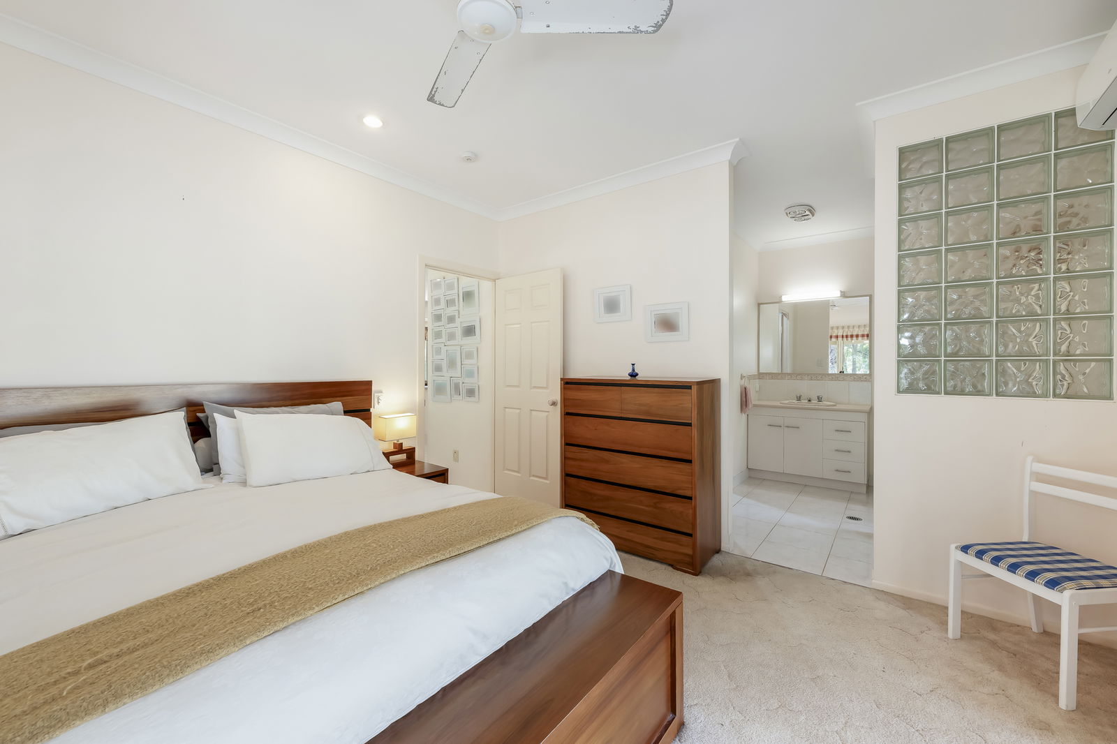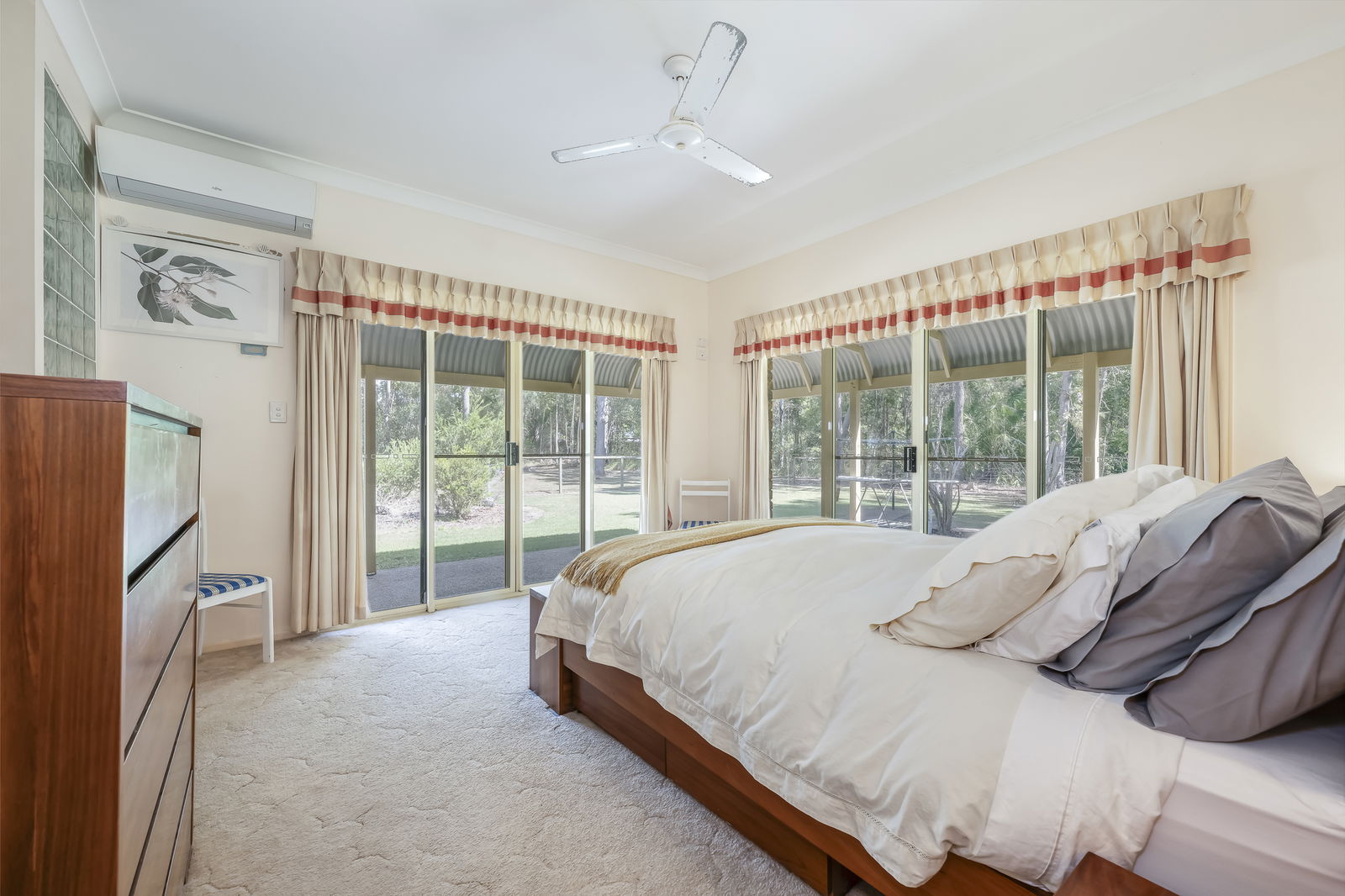 - Bedroom 1: Carpeted, built-in robes, verandah access, air-conditioned, and ceiling fan