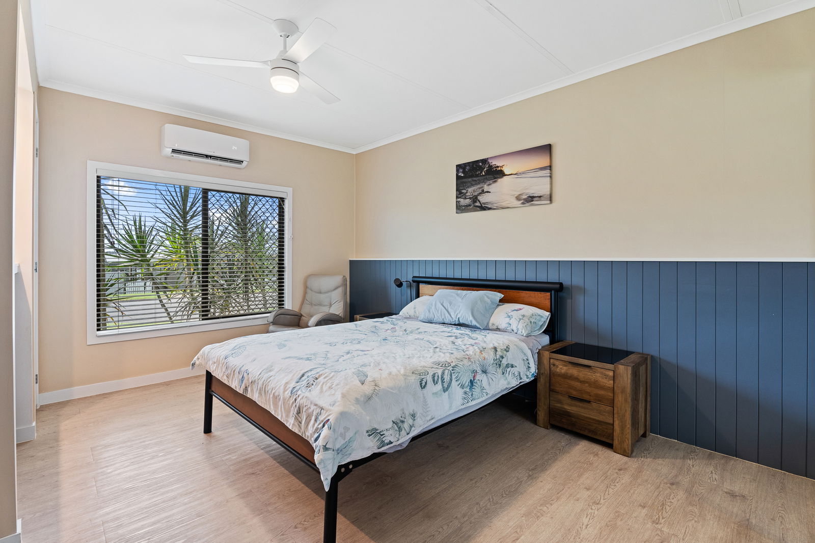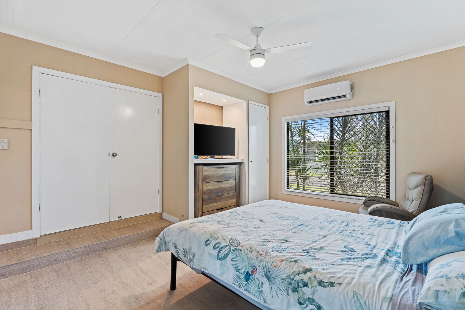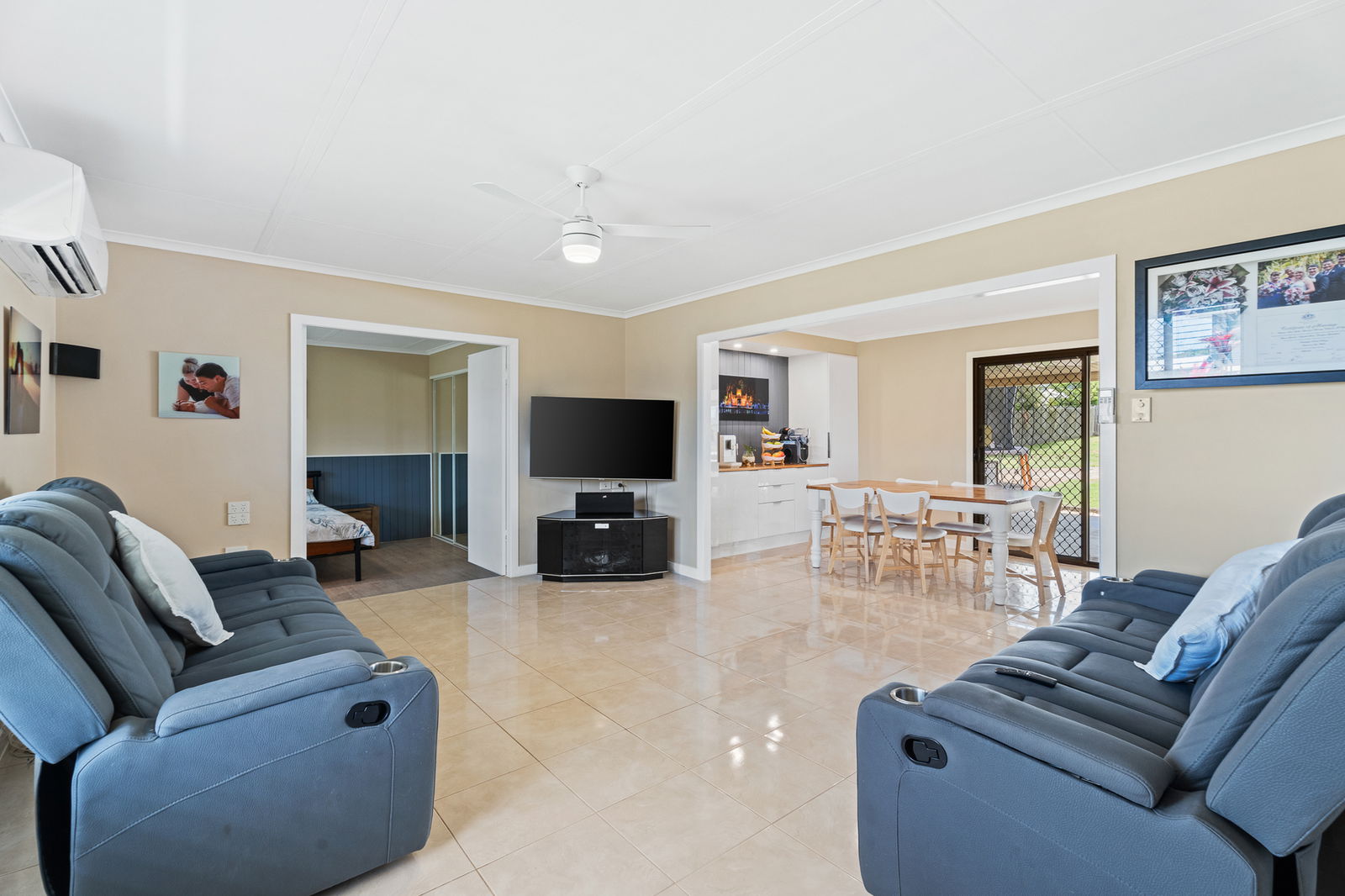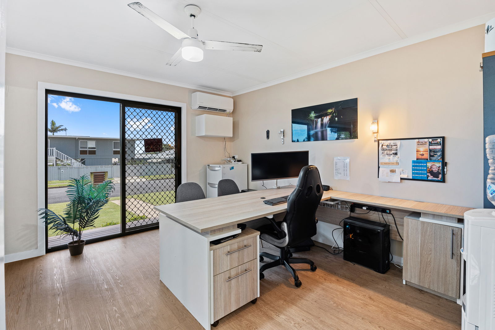 Split-system air-conditioning throughout (7.1kW Mitsubishi in lounge, 3.5kW Mitsubishi in office, 3.5kW Hisense in bedroom)