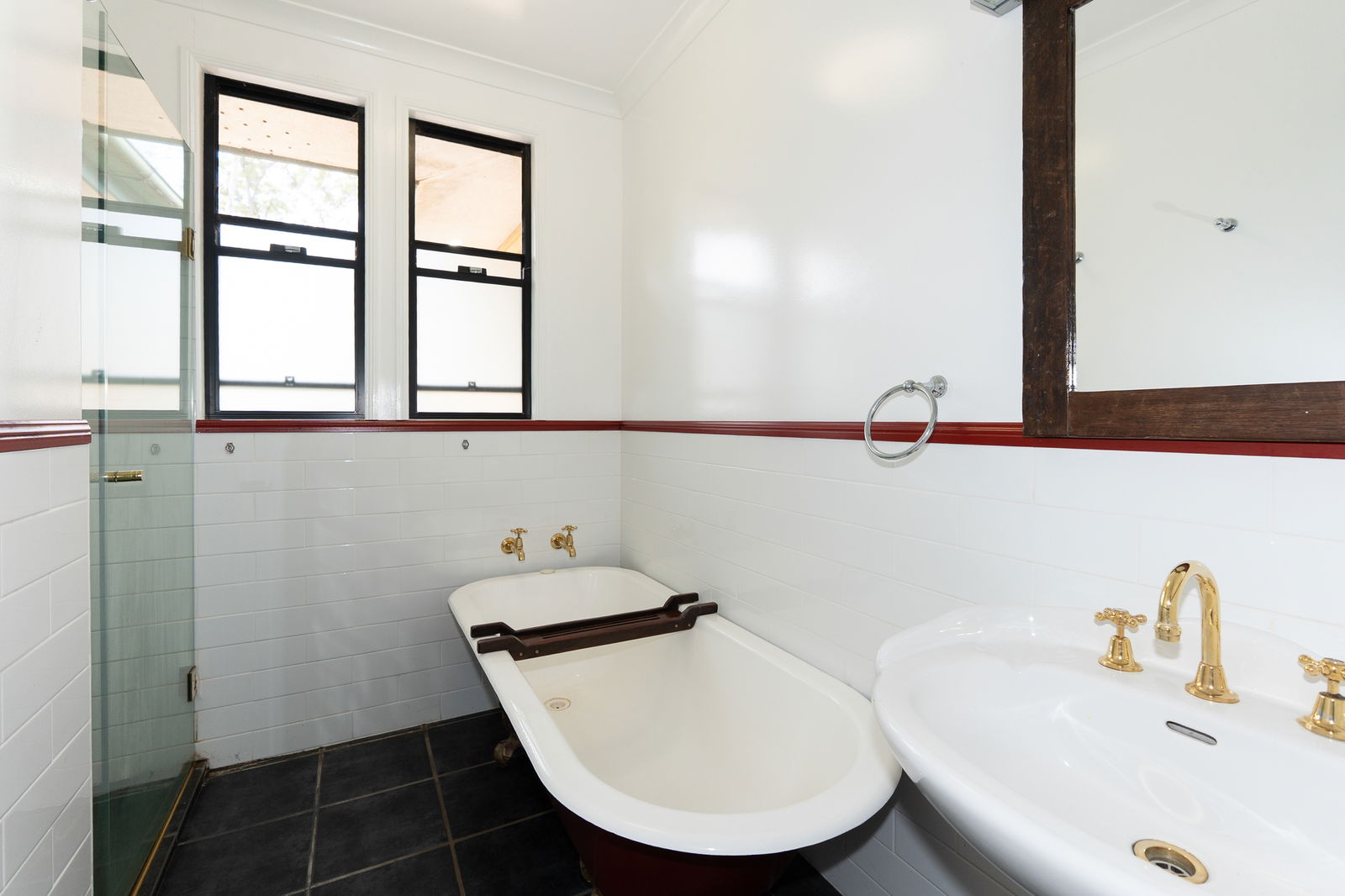 Main bathroom showcasing a cast iron clawfoot bath, pedestal vanity and shower with exposed matching brass hardware to tie everything together