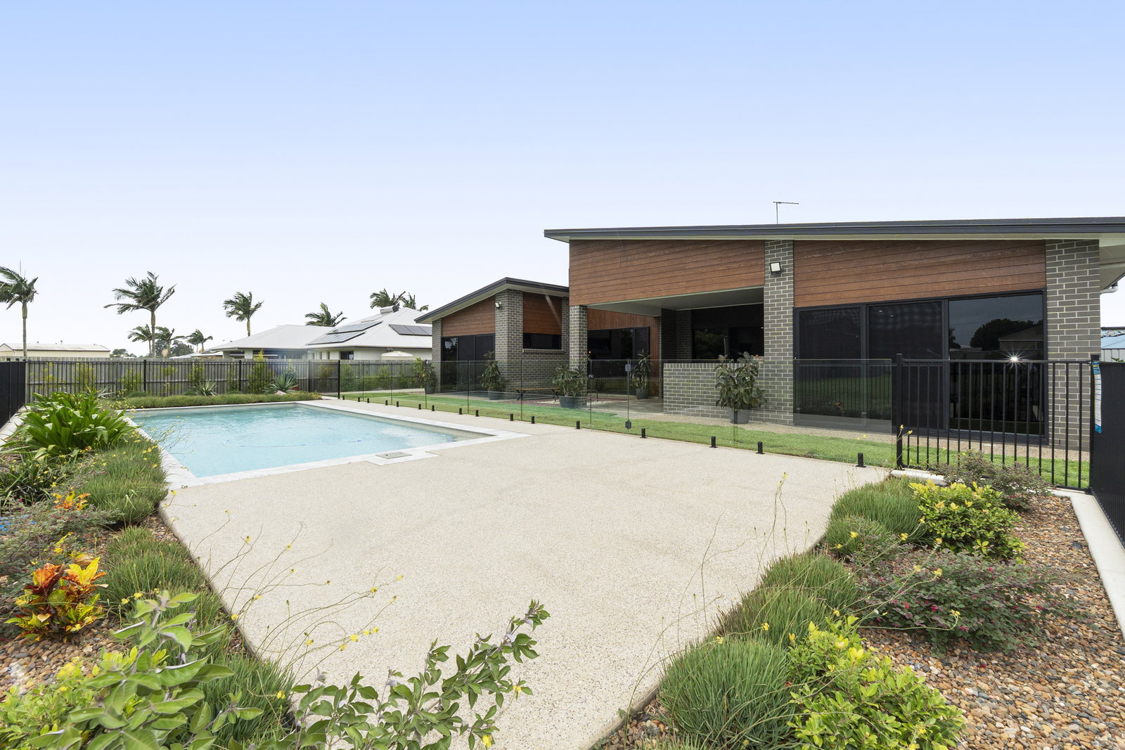 - The covered alfresco sits under the main roofline at the junction of the living and games room, overlooking the stunning 10m x 4m inground mineral pool. A textured concrete surround with a dedicated lounge area and lush garden borders creates a private and resort-like poolside setting - all safely enclosed with glass pool fencing and just a few steps from the alfresco gate
