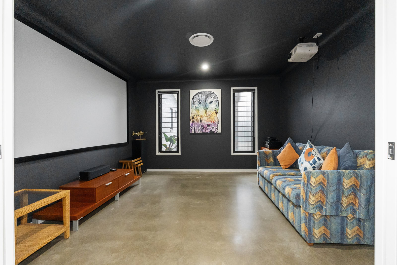 - Just before the main living, a fully enclosed media room with blacked-out finishes creates a dedicated and immersive viewing experience - a space entirely separate from the rest of the home's activity