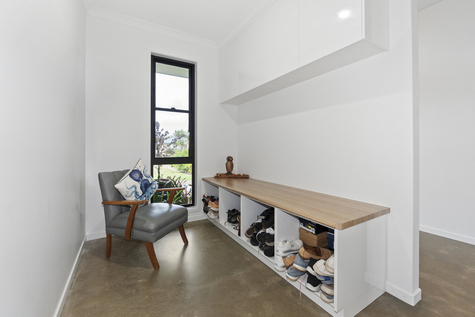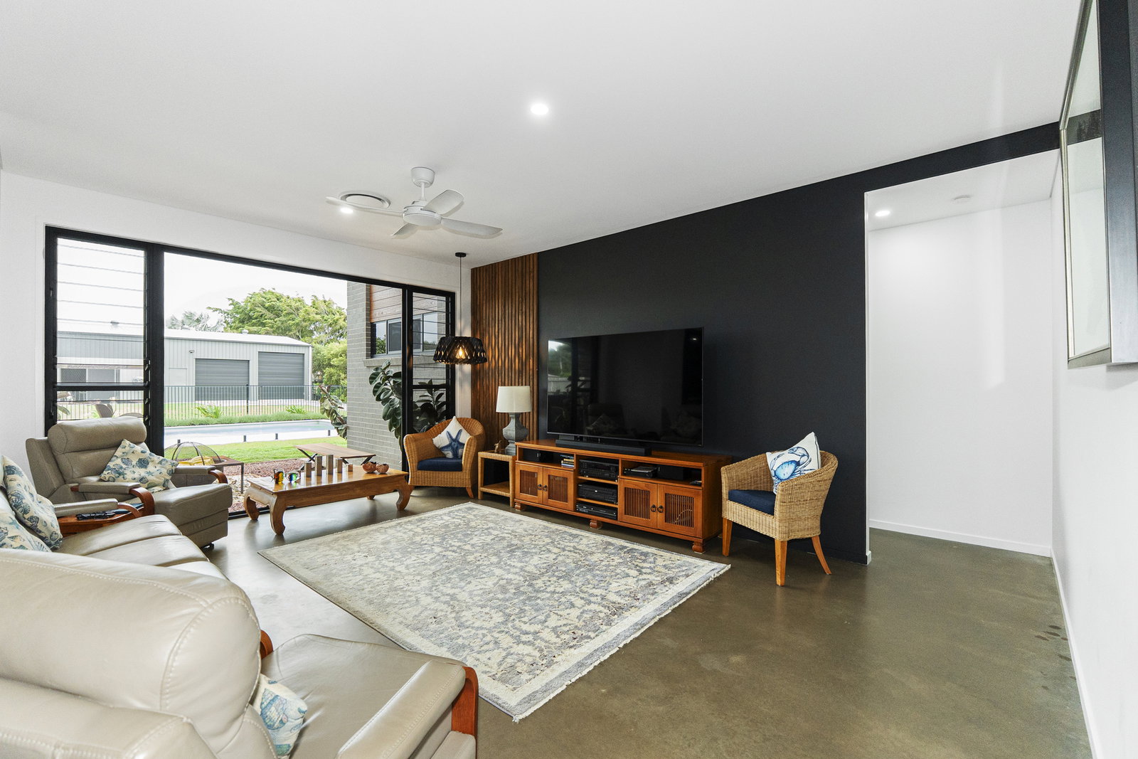 - A wide, generous entry hallway runs through the heart of the home - to the right, a convenient sitting room for shoes, jackets, and keys offers a tidy and welcoming arrival experience. Continue down the hallway and the home opens dramatically into the main living area, offering a near-uninterrupted sightline straight through to the sparkling pool beyond