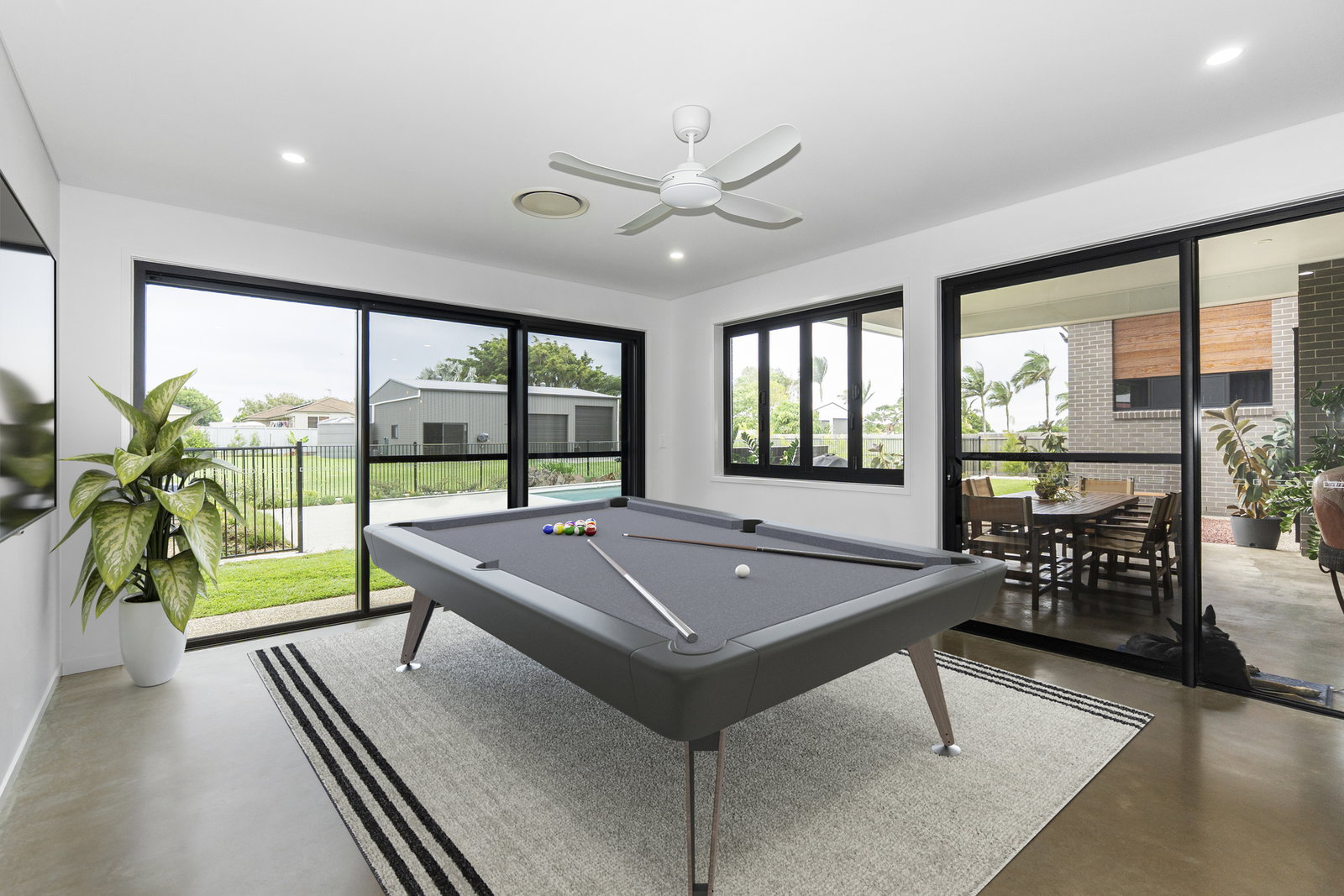 - The games room extends off the main living area, wrapping around the alfresco in an L-shape, with glass doors showcasing the pool and outdoor entertaining space blurring the line between inside and out