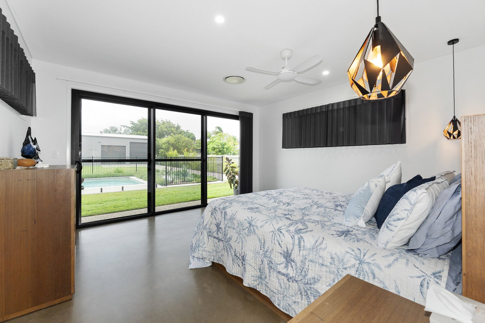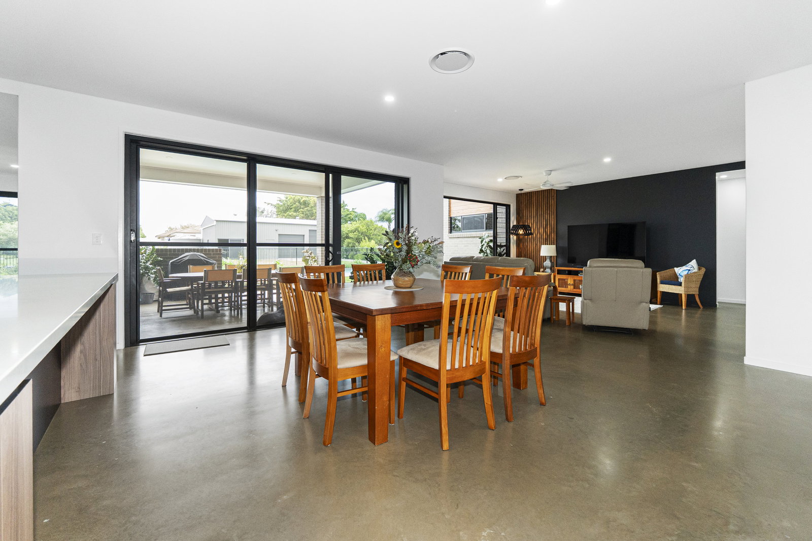 - The expansive open-plan living, dining, and kitchen area forms the true heart of the home, bathed in natural light with large windows and glass sliding doors framing the spectacular pool and alfresco outlook