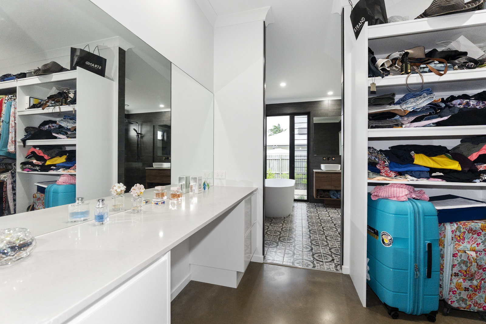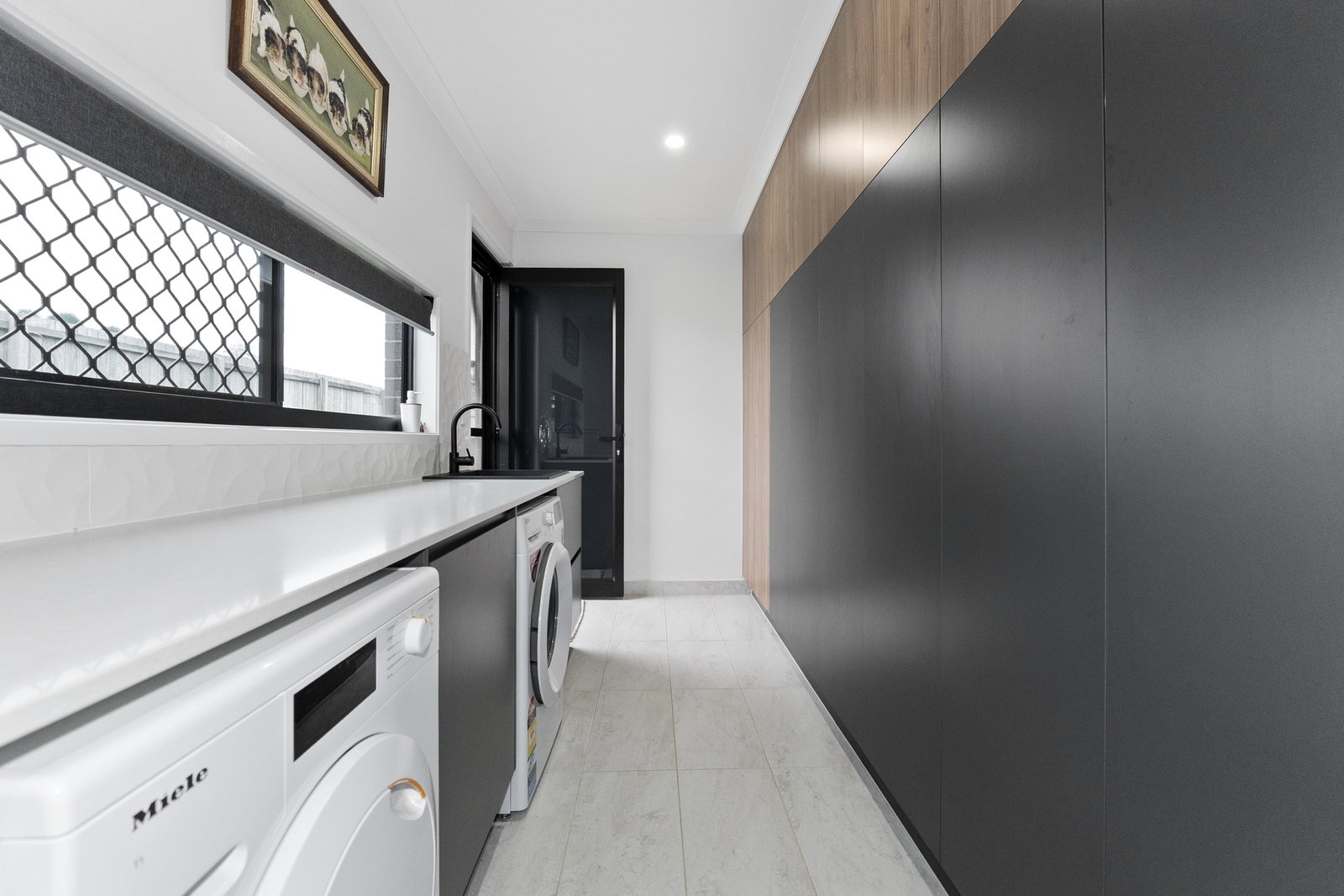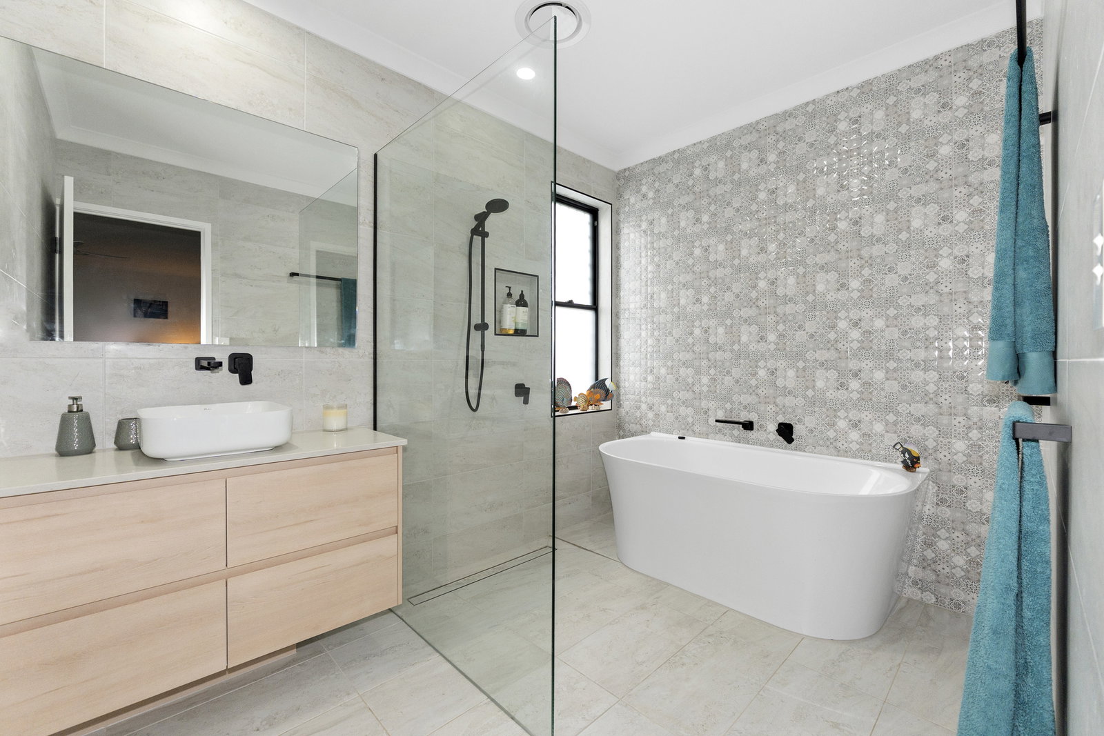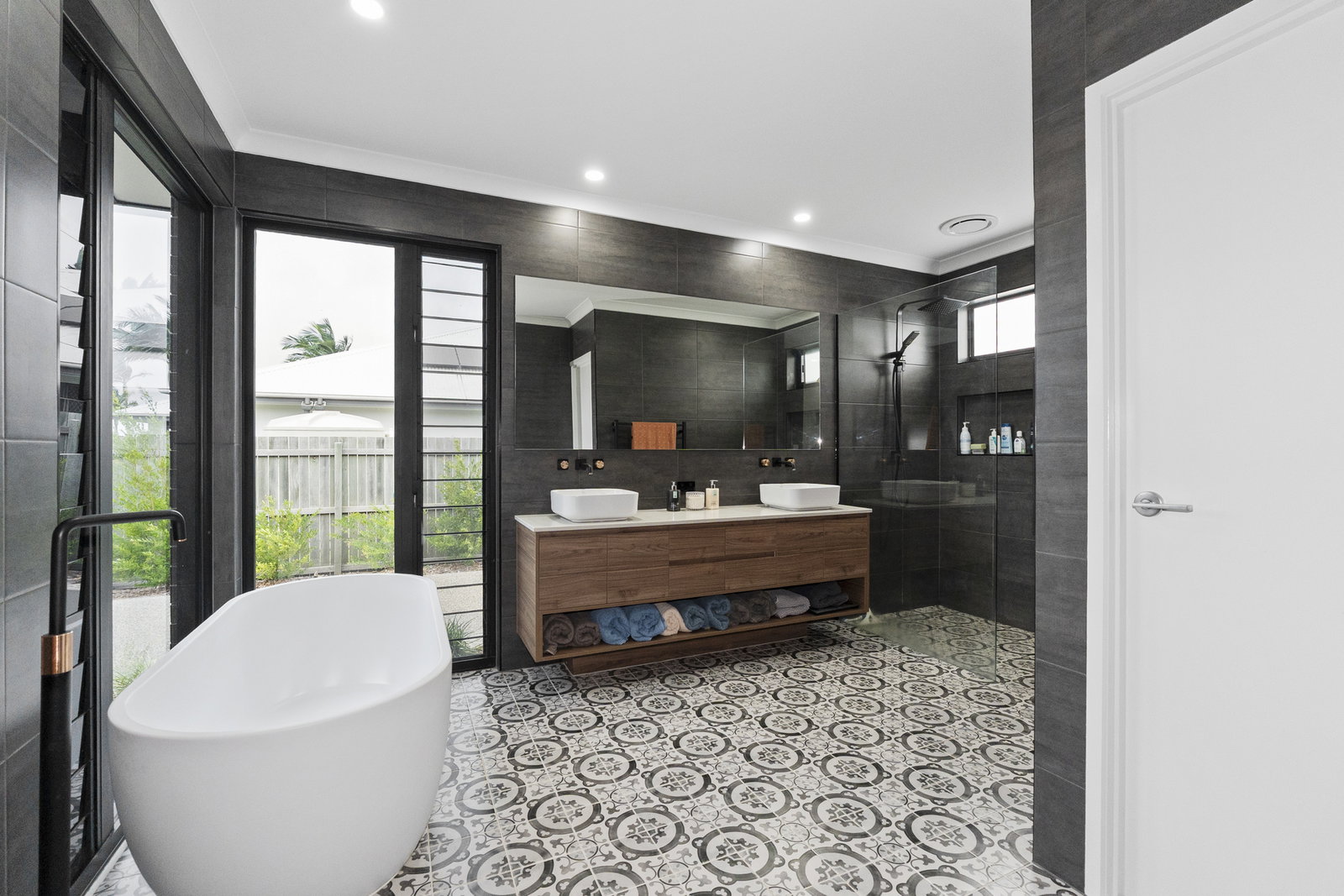 - Privately positioned in the rear of the home, the luxurious main bedroom features glass sliders opening directly to the backyard and a generous walk-through robe. The ensuite is nothing short of extraordinary - floor to ceiling charcoal tiles contrast against a stunning black and white patterned floor, while the freestanding bathtub sits in its own corner beneath floor-to-ceiling louvred windows that bathe the space in natural light. A completely separate rainfall shower with handheld option and recessed tiled shelving, a dual floating vanity, and a privately screened toilet