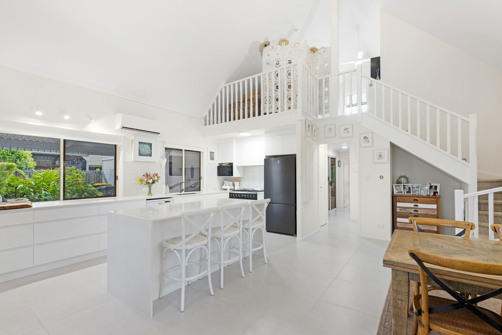 •Open-plan living and dining with soaring vaulted ceilings and a striking mezzanine level